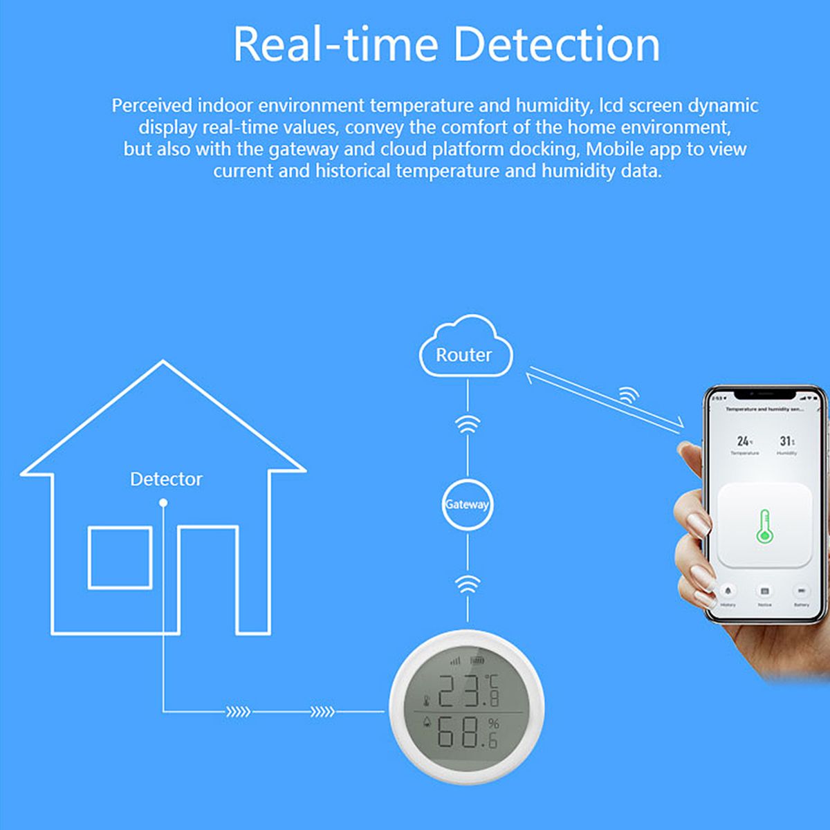*With the gateway and cloud platform docking, perception of temperature and humidity changes and real-time report to the users phone. You can view current and historical temperature and humidity data.