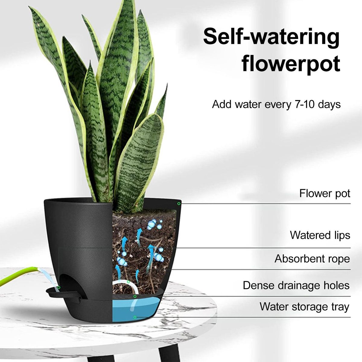Our large capacity flower pot, the perfect solution for plant lovers who want to ensure their plants stay hydrated even when they're away. with its deep reservoir, this 8-inch self-watering pot can hold enough water to keep your plants nourished for up to 2-3 weeks, making it ideal for vacations or busy schedules. the built-in tray protects your surfaces from any water spills, whether you place it on your deck, patio, or indoors.