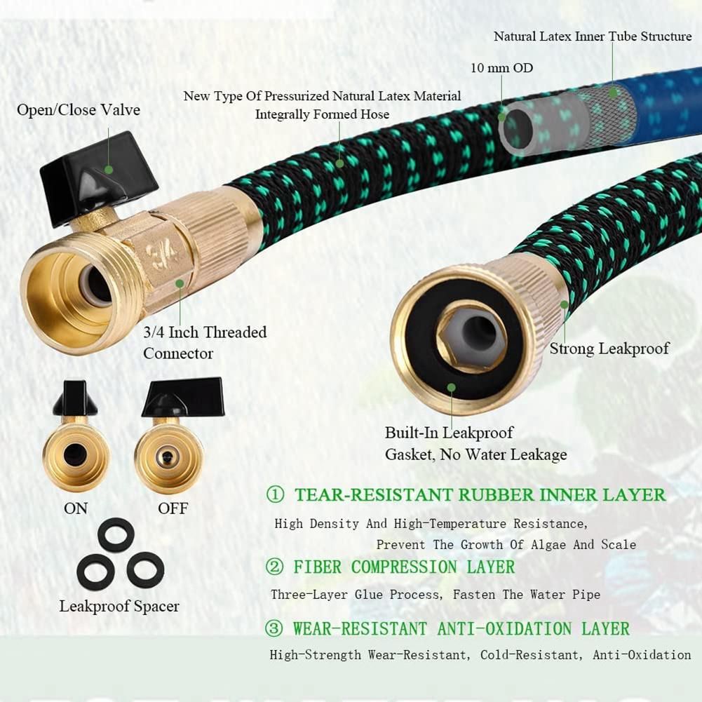 Detailed Information About The Product:[Simplify Your Watering Work]- Our Expandable lightweight garden hose 50 ft adopts an expandable design.3-layer latex tube 2mm thick tube ,when water pressure is on our stretch hose can quickly expand 3 times to its original length in use, the water hose will automatically expand underwater pressure Flexible Kink-free strong and flexible hose can keep its shape to the maximum even if it is bent