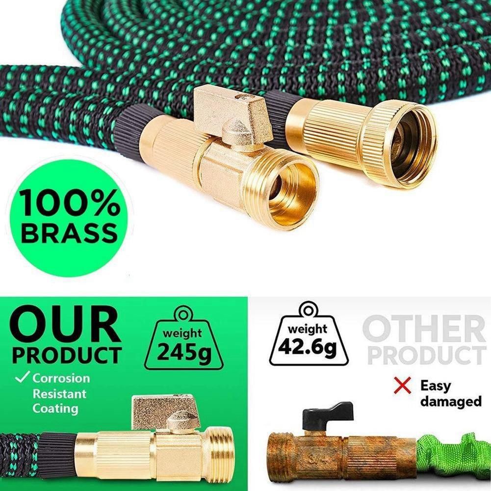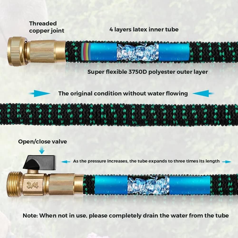 Detailed Information About The Product:[Simplify Your Watering Work]- Our Expandable lightweight garden hose 50 ft adopts an expandable design.3-layer latex tube 2mm thick tube ,when water pressure is on our stretch hose can quickly expand 3 times to its original length in use, the water hose will automatically expand underwater pressure Flexible Kink-free strong and flexible hose can keep its shape to the maximum even if it is bent