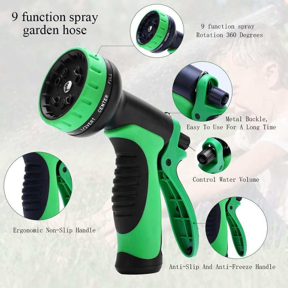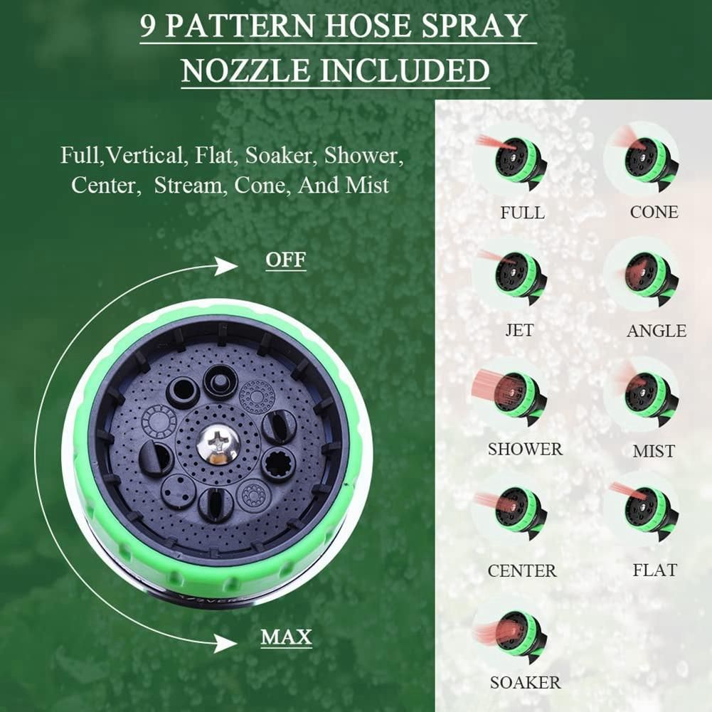 [Multi-Function Nozzle]- Our 50 ft garden hose comes with a 9-function nozzle, which can change the water flow pattern by rotating the water outlet. And, it also contains a metal buckle, which allows you to easily maintain a continuous flow of water. The nozzle adopts an ergonomic design as a whole, with a comfortable grip and non-slip.
