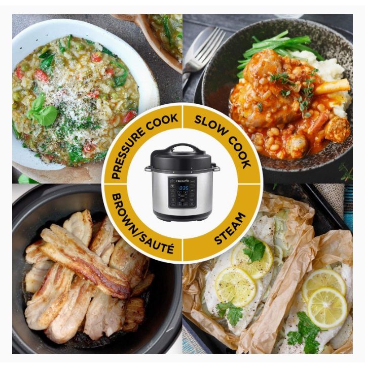 4 Ways to cook: pressure cook, slow cook, steam, and brown/saute. Easy-to-use controls with 8 one-touch programmes for mealtime favourites