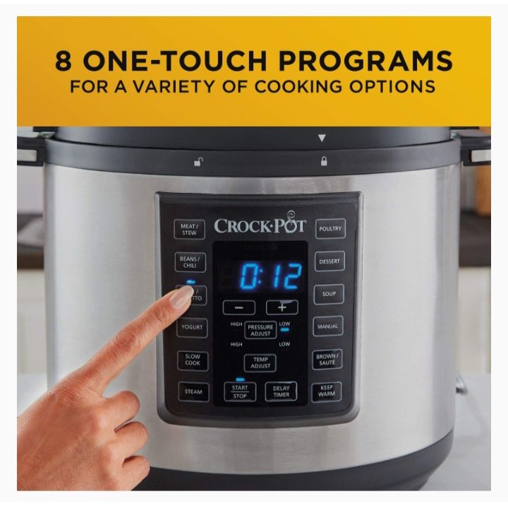 Other functions: Slow Cook, Steam, Brown/Saute and Keep Warm, plus Pressure Adjust, Temp Adjust and time adjust buttons.