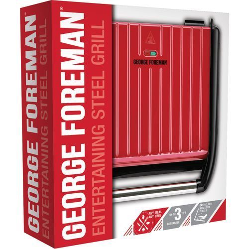 George Foreman grill has a new contemporary design with an upper steel lid in a statement red, making the seven portion grill a winner in performance and appearance. For a fast dinner fix, or a weekend party, George Foreman grills cook delicious food. With a new perfect fit drip tray and rear adjustable foot for angled grilling, you can drain away the excess fat. And, if you want to neatly store your George Foreman Grill away, it also comes with a cord wrap that allows for easy vertical storage.