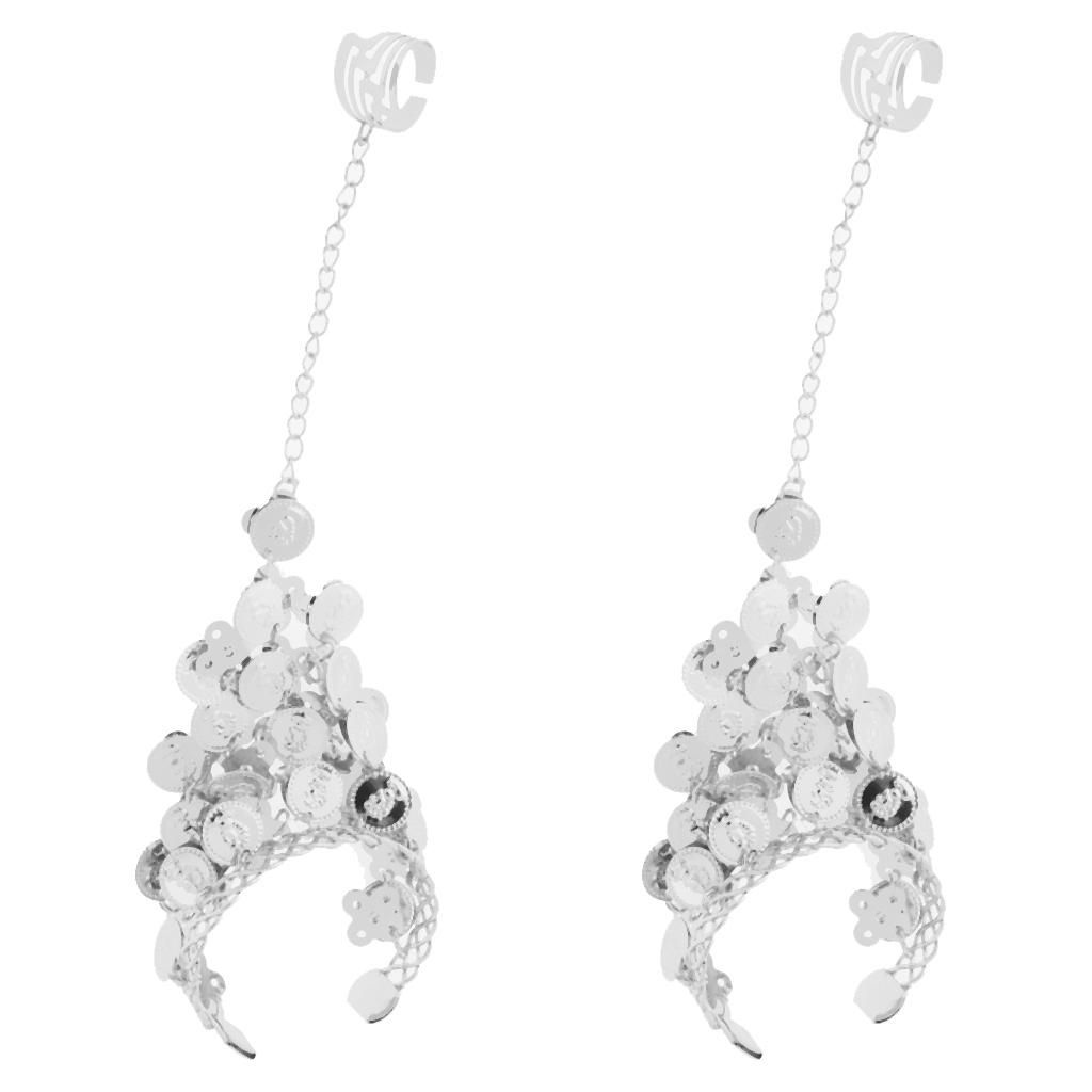 The necklace and headwear are designed into triangle shape, constructed of round coins pieces, exuding a strong exotic atmosphere.