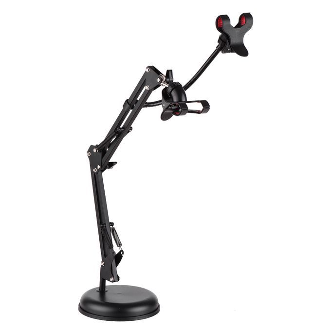 This is a cell phone holder supporting dual phones with 2 sections extendable arm bracket which can rotate in 360° for hands free table using.