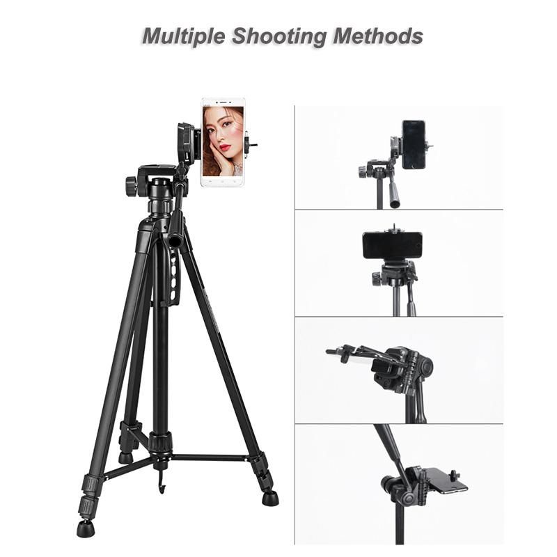 Features:The design of 360 degree rotatable is the best choice for outdoor photograph. Retractable design which can be folded for easy carrying. Supports digital camera, card camera and smart phone. Add LED ring light, make live video and studio as easy as possible. With non-slip foot base, which make the holder stable for many of those wonderful photos. It is designed for photograph lovers to help them take good scene or group photos without long time hand holding. Specifications:Item type: tripod stand Material: aluminium alloy Color: black Size: Folded Height: about 575mm Extension Height: about 1400mm Weight: 0.92 Kg Function: For camera, smartphone, adding ring light for live video/selfie photo etc. Package details:T1 includes: tripod+phone holder+bluetooth remote T2 includes: tripod+phone holder+bluetooth remote +center column clip T3 includes: tripod+two-cell phone stand with 2 phone holders +bluetooth remote T4 includes: tripod+three-cell phone stand with 3 phone holders+bluetooth remote T5 includes: tripod+phone holder+bluetooth remote+center column clip+6 inch ring light T6 includes: tripod+phone holder+bluetooth remote+center column clip+10 inch ring light