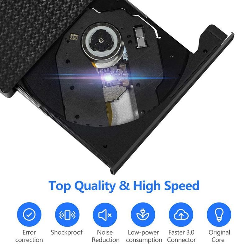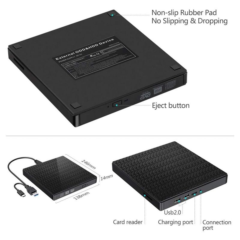 4 IN 1 EXTERNAL DRIVE: external CD burner has a USB 3.0 Dual-C interface, an SD card slot and 2 USB 2.0 ports, it can be used on more devices and provide you strong fault tolerance. (Note: the USB disks SD cards are not included) UNIVERSAL COMPATIBILITY: Portable CD DVD drive is compatible with most systems:Windows 10 / 8 / 7, Vista 7 / 8, XP, Linux, OS10.6 or above. It also supports varies discs: CD-R, CD-ROM, CD+/-RW, DVD-ROM, DVD-R, DVD+/-RW, DVD-R DL and VCD ROM discs(Chromebook are not supported) HIGH SPEED: Advanced reading technology, provides Max 8x DVDR Write/Read Speed and Max 24x CD Write/Read speed. With USB3.0, offers a max data transfer rate of 5Gbps, Pictures and sounds quality are much more vivid and clearer when enjoying movies. CD PLAYER PLUG AND PLAY: Easy to use,powered by USB port. No external driver and Power needed. Just plug it into your USB port and the DVD driver will be detected automatically. Watching movies, listening to music, installing software, burning disc MULTIFUNCTIONAL OPTICAL DRIVE :Adopted intelligent technology,, -up on and disc tray Design makes it convenient to read or write discs.the You can use it for entertainment, office and to learn or work anywhere and anytime. colour:Black Material:Metal size:138 x 146 x 14mm Package Contents: 1 x USB CD drive(CD not included) 1 x Type-c adapter Only the above package content, other products are not included. Note: Light shooting and different displays may cause the color of the item in the picture a little different from the real thing. The measurement allowed error is +/- 1-3cm.