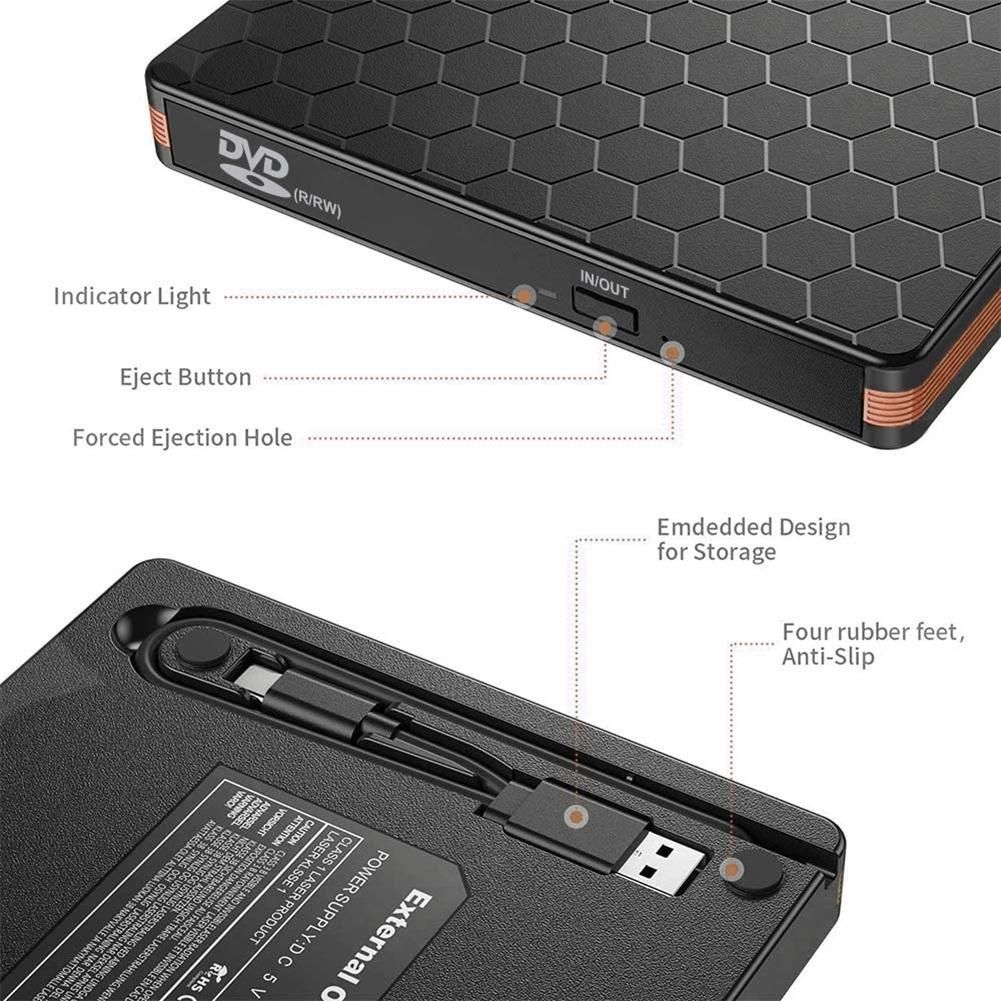 [Portable DVD Drive-Slim & Compact] Embedded cable design with slim, lightweight body, external drive can be put in your travel bag and connected at any time, which makes it a companion for computers without internal drive, take it with you anywhere and anytime.