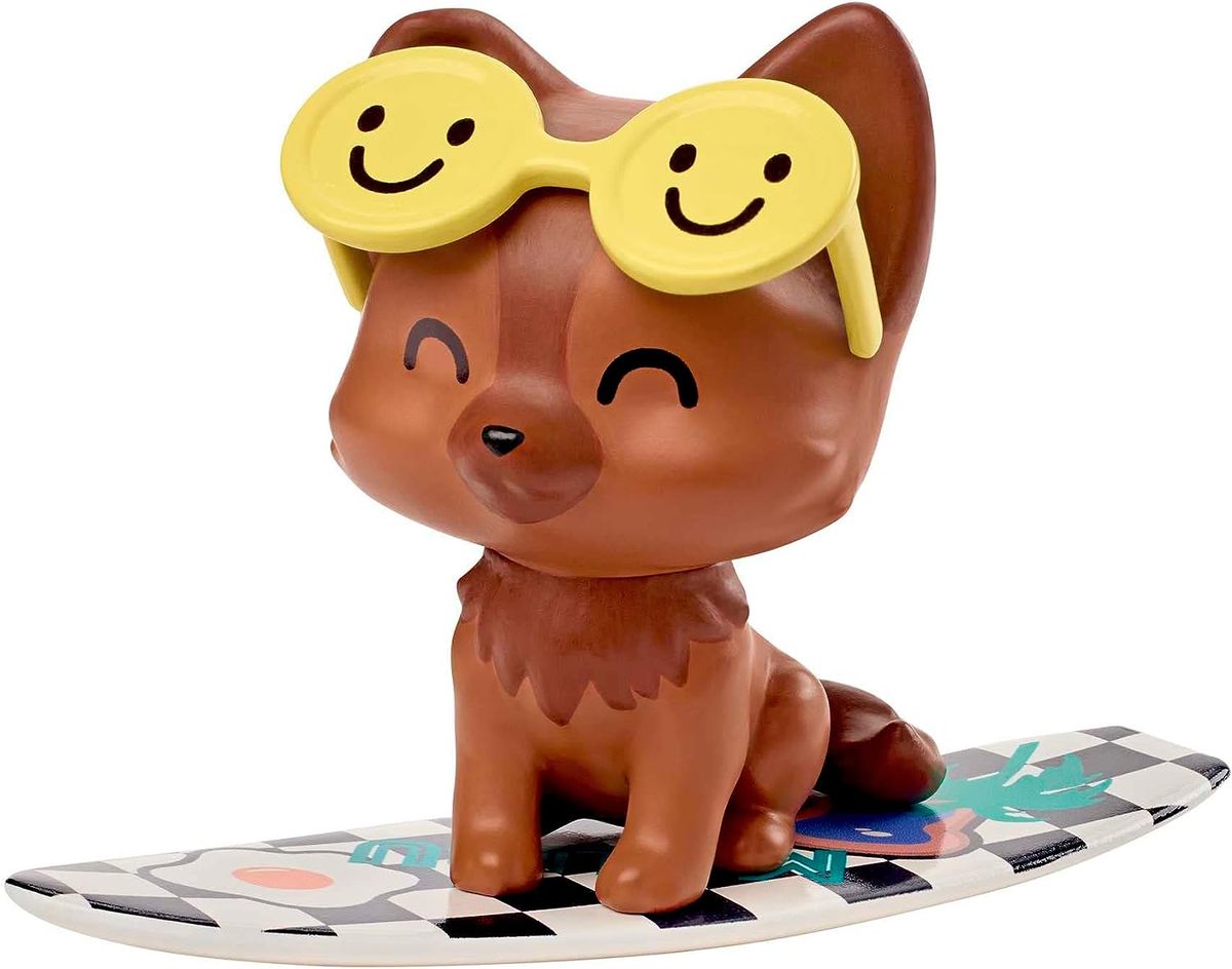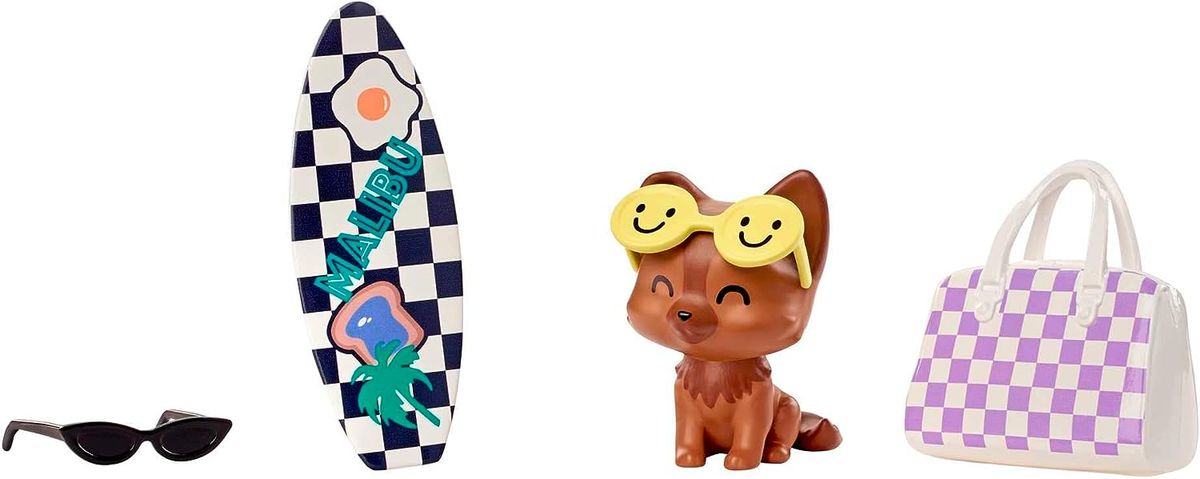 Her pet puppy is oh-so-EXTRA, too, with oversized smiley face sunglasses and a checkered surfboard