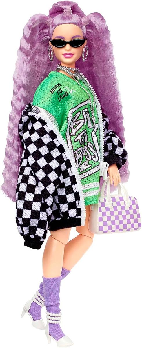 Barbie doll is curvier than the original body type, and her look goes big with extra-long, pastel-purple crimped hair styled in half-up ponytails