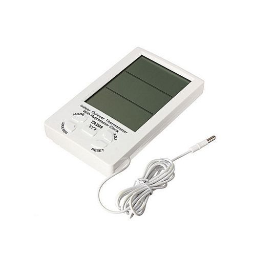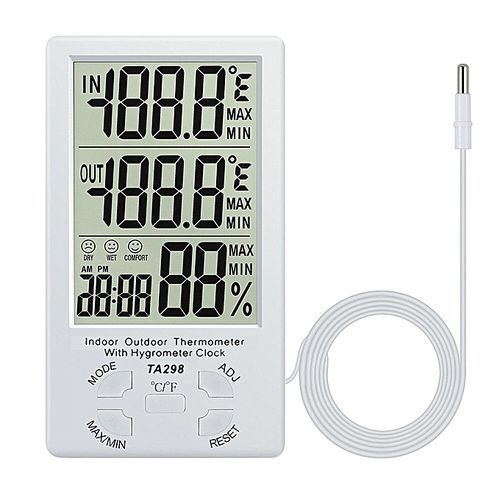 - This extra large LCD display makes temperature and humidity easily to read. It is also equipped with sensor probe for collecting the temperature in outdoor environment
