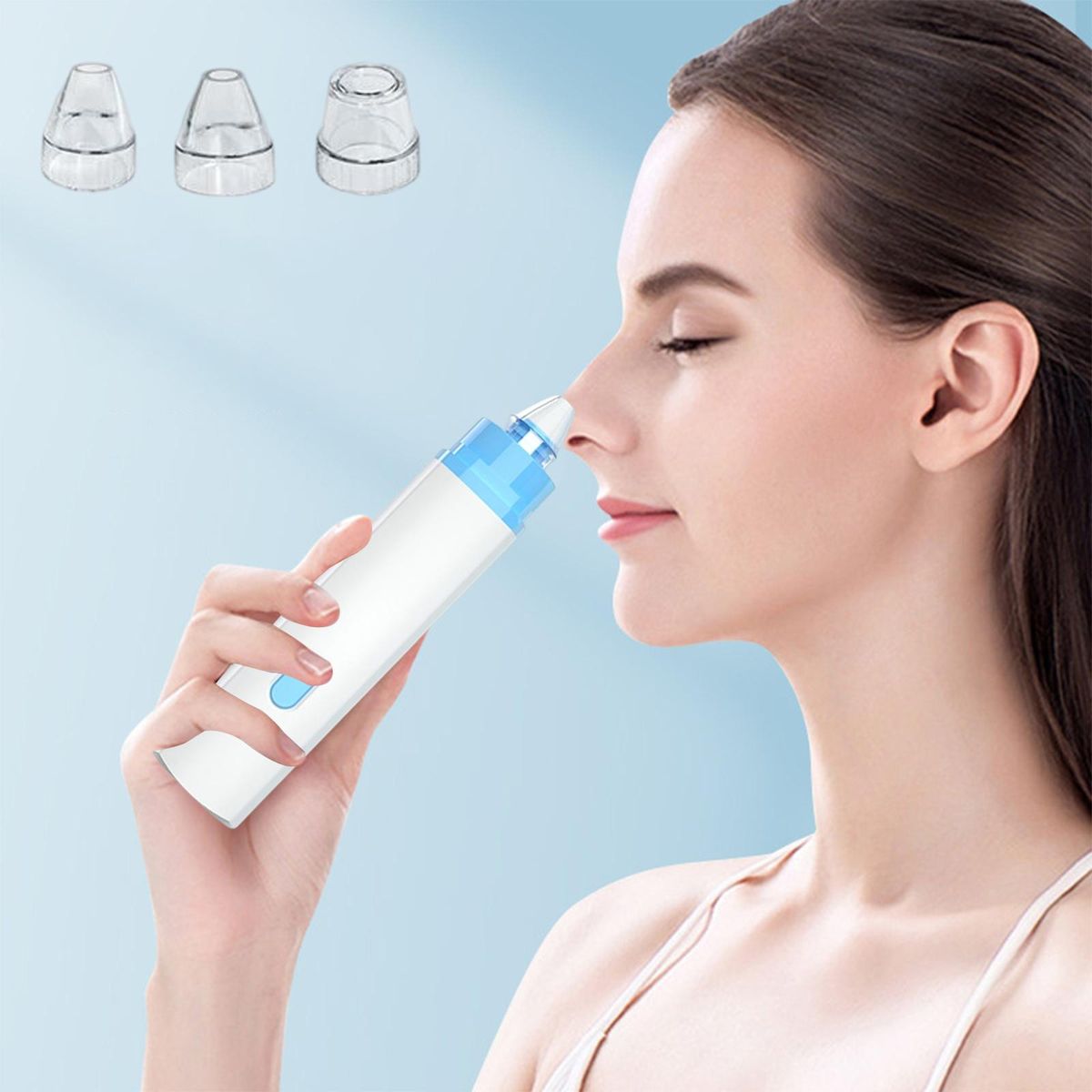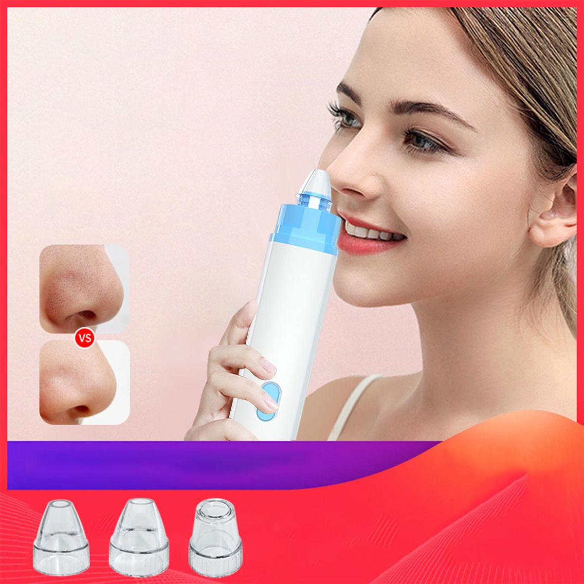 3 suction heads for free adjustment, widely suit different skin types. Small round , suitable areas such as tip/perinasal, for local deep cleaning; Elliptical medium hole tip, suitable for , circumference for multi directional cleaning; Round large hole tip, suitable for use nose, quickly removes .