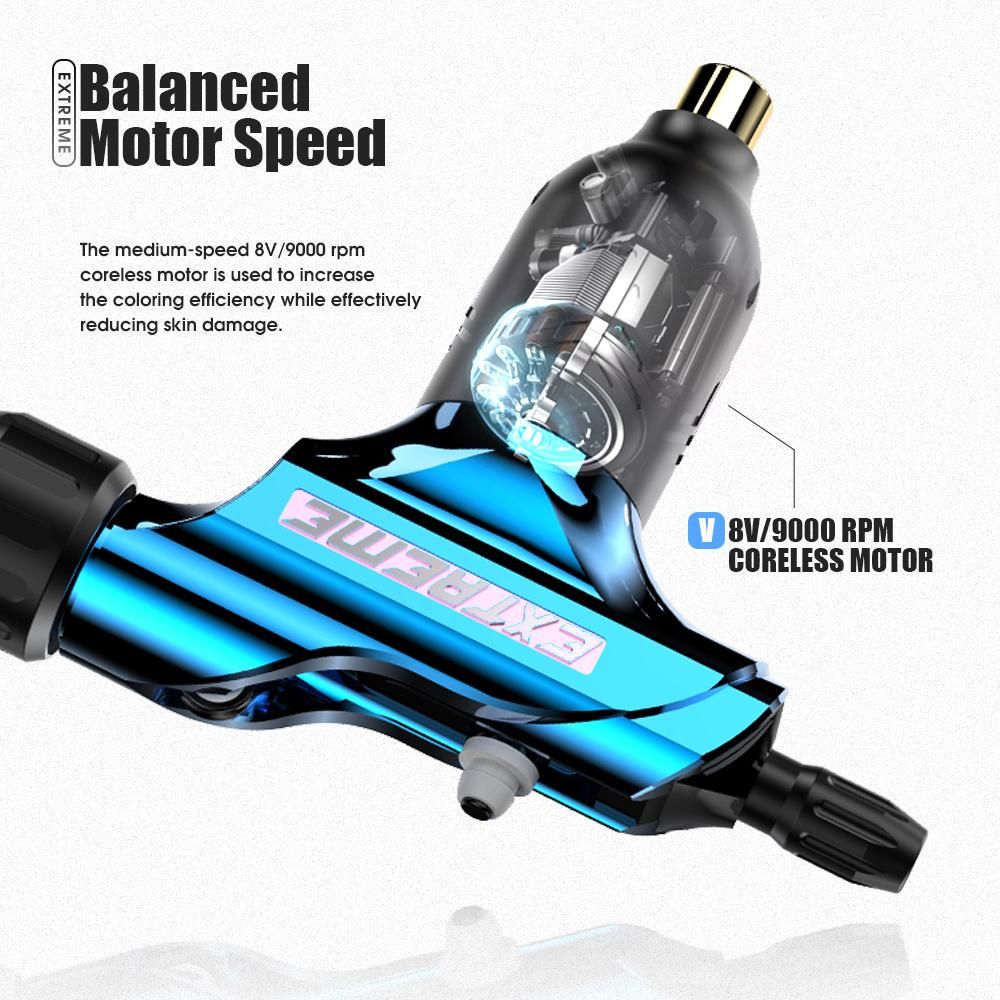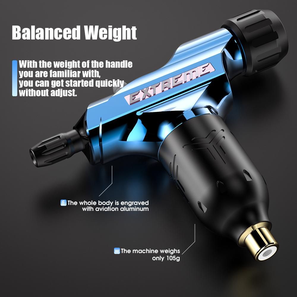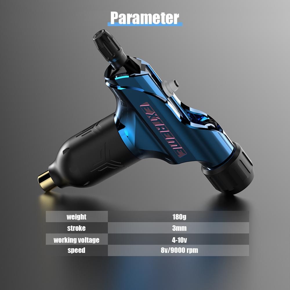 Weight:180gStroke 3mmworking voltage 4-10VSpeed: 8V/9000RpmThis slider machine comes with a coreless motor, which has an operating speed of 8v /9000Rpm, low noise, long-lasting stability power strong.working voltage 4-10V.EX-3 rotary machine frame made by aircraft aluminum,polished and Anodized frame and motor housing for a brilliant look.The machine has adjustable hit from soft to hard with a simple twist of the slider tensioner.This rotary tattoo machine has an extremely smooth design, there is virtually no vibration, and it runs very quietly suitable for tattoo artistCompatible traditional tattoo needles and tattoo cartridges needles .RCA Connection. It is a lightweight and well-balanced design that will help prevent an artist from having fatigue issues.