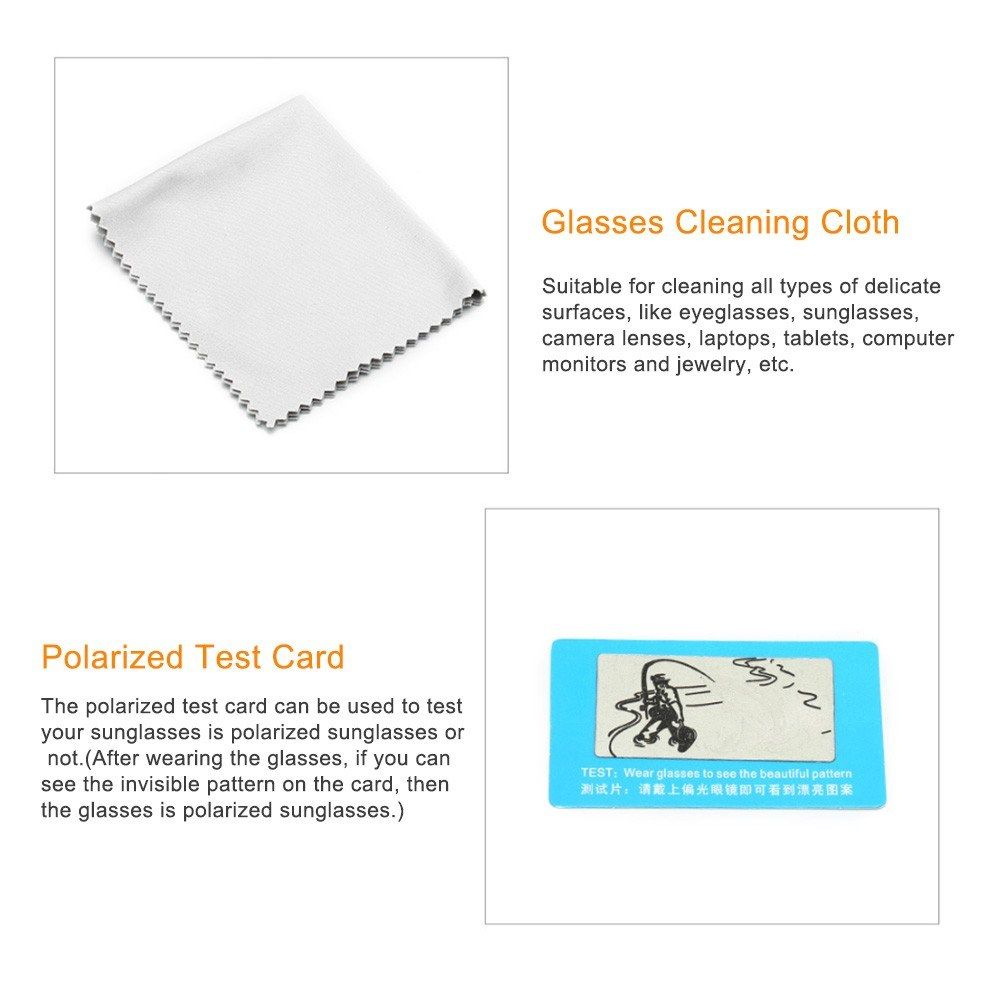 There are some accessories providing for sunglasses, including polarized test card, glasses cleaning cloth, glasses storage case and small screwdriver, you can choose which you need from these accessories.