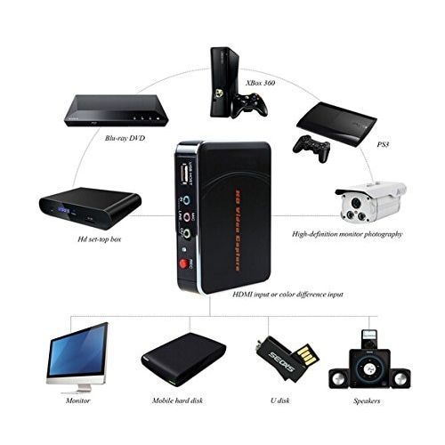 HDMI / Records captures games to 1080 P, and then save them to a USB flash drive or USB hard drive Simply plug one USB Flash drive (FAT32 support only), to get the video anywhere, anytime; Share gameplay and have fun with your friends wherever you are,support up to 128G for USB drive & 2TB for hard drive,support MIC. With extra audio input allows you to record your own voice (NO conversation)with a microphone live video gameplay together, Easy to use, without any adjustment, PC is not required. 1080 P one-touch recording, and press the button again to stop recording Compatible with all HDMI outputs, you can capture a 1080 P video via HDMI comforter out of the game (for the Xbox 360 and one for the PlayStation 3 and 4, for the Wii U), STB, DVD, BlueRay or other video source.