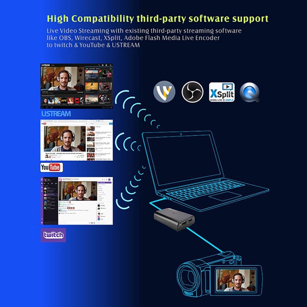 2. Support UVC standard, no driver installation required, and work with most on Windows or . Allow live video Stream ing, webcasting or video conferencing to Skype, Facebook live, YouTube live, Livestream,Ustream, Dacast, Wowza Cloud