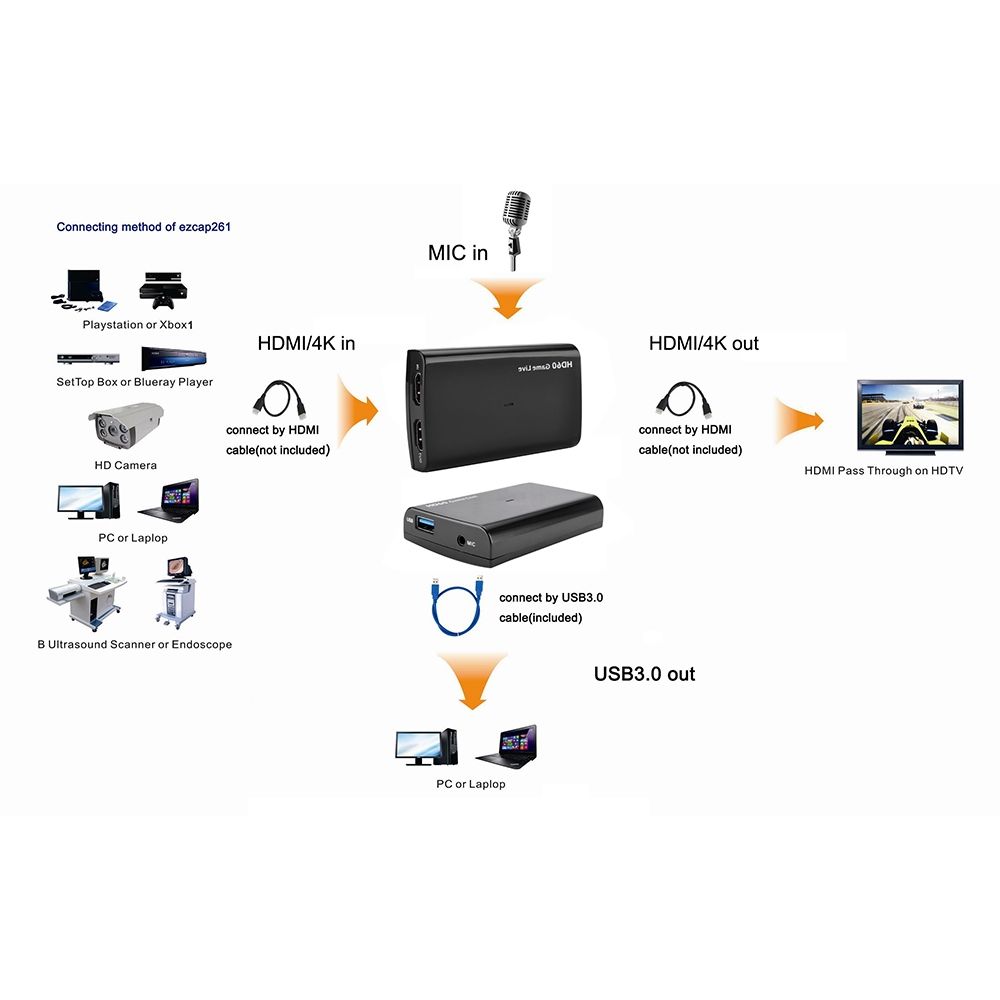 3. With HDMI pass-through, can connect with big displayer to play game once you Stream ing. With Micro Phone input, can record your voice with video together easily