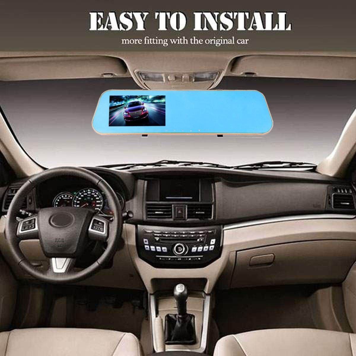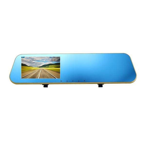 Feature: 1. Dual camera with all glass, rearview mirror camera and rear view camera. 2. 4.3'' TFT HD screen, Anti-glare optical blue mirror. 3. 140 degree Ultra High-definition wide angle lens, flexible front lens, can adjust to any direction. 4. 1920*1080P 30fps FULL HD resolution, there are two low illumination high-definition video to choose(1920*1080,1280*720). 5. Glitter light gold metal lens and frame, rare and unique. 6. G-sensor, impact sensitivity adjustment automatically lock file. ?7. loop-cycle recording. ?8. Motion automatic recording. 9. High sensitivity parking monitoring. 10. ?With AV-in port, can pull a rearview camera. 11. Picture display. ?12. video time-stamp. 13. Drive start simultaneously, can charge while shooting.