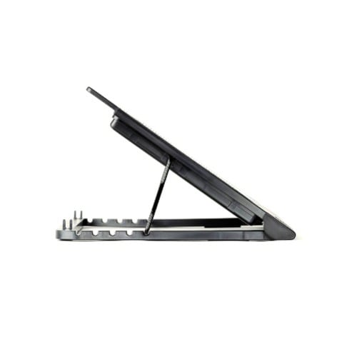 Notebook/Laptop Stand & Cooling Pad - Fan 9" To 17 & Prime; (inch)Product Description Cooling Pad For 9" to 17 & Prime; (inch) Notebooks Adjustable Angle Stand (5 different heights) 140mm speed adjustable Silent Fan Ergonomic Design Port USB fan Desktop Setup Movable Anti-slip propsErgonomic Design: With the sturdy engineering structure, This Notepad offers 5 different height settings for laptop users' better-viewing angle. Ease the pains of the neck and wrist for heavy users. Optimal Cooling Performance Metal mesh surface with built-in 14cm silent fan (without fan frame) performs ultimate thermal solution. Adjustable fan speed control & on-off switch adapts to various working environments. Great Compatibility Two anti-slip props with adjustable width setting design are specially for accommodating from net book to large size notebook, including widescreen. Easy front I/O port access for all types of laptops. Value-added Features: USB hub for connecting to various accessories. Two side handles for smart cable management. Rear USB cable clips for easy cable storage. long lasting battery
