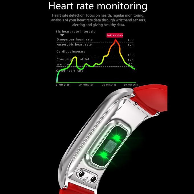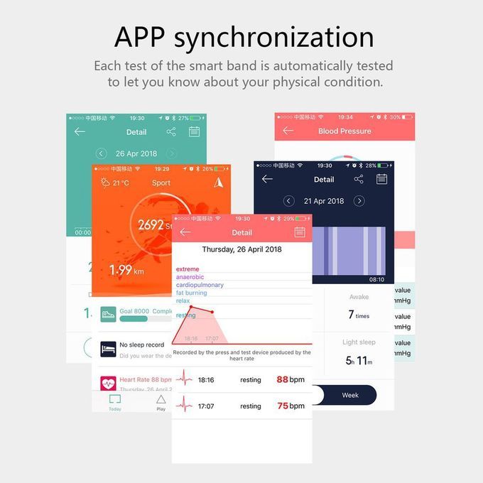 Fun tions: Heart rate and blood pressure monitor, Sleep monitoring (sleep time, sleep qu ty, wakefulness), sedentary reminder, Time display, step ount, distan e and alories, alls, We hat, QQ, SMS, and A a li ations, su h as vibration reminder + text push, Anti-lost reminder, Alarm lo k, et