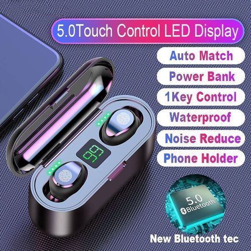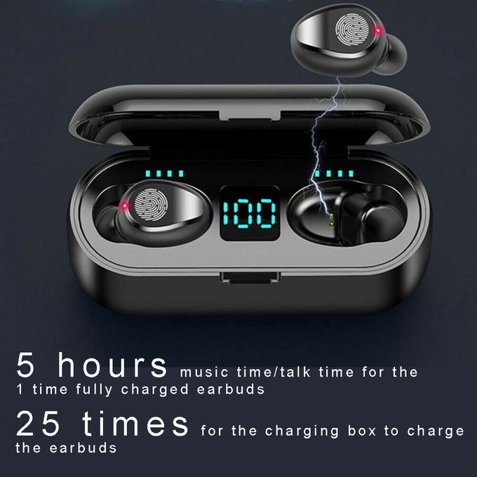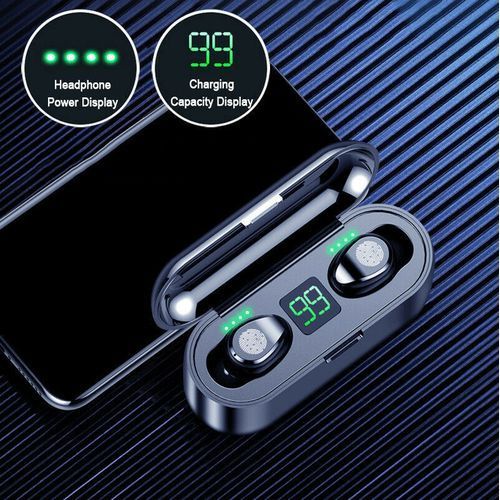 2. LED Number display,More convenient to know the power of headphones. 3. Smart Touch Control Technology, Auto pairing,Ergonomic Design. 4. single ears Call, F9 brings a highly restored real voice, the call is as clear as face-to-face 5. IPX5 Waterproof,no fear of rain and sweat,can swimming. 6. Cvc 8.0 noise cancellation,Immerse yourself in music. 7. Can be carried out, single or double ears used alone, to provide more sharing possibilities 8. 8D Surround Sound,Phone support,Siri Voice Assistant. 9. HD high fidelity sound,bluetooth 5.0 Strong stability. 10.Multi-function charging compartment, can be used as a portable phone holder when watching video