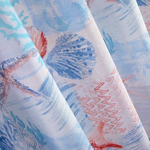Features a bright, colorful seashells and marine life print in a soothing aqua palette.