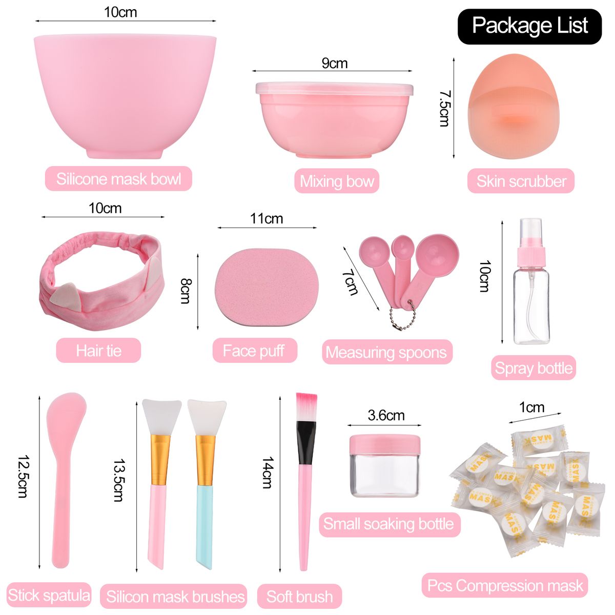 24 in 1 set comes with 1 silicone mask bowl, 1 mixing bowl, 1 skin scrubber, 1 hair tie, 1 stick spatula, 2 silicon mask brushes, 1 soft brush, 1 face puff, 3 measuring spoons, 1 spray bottle, 1 small soaking bottle, and 10 pcs compression mask.