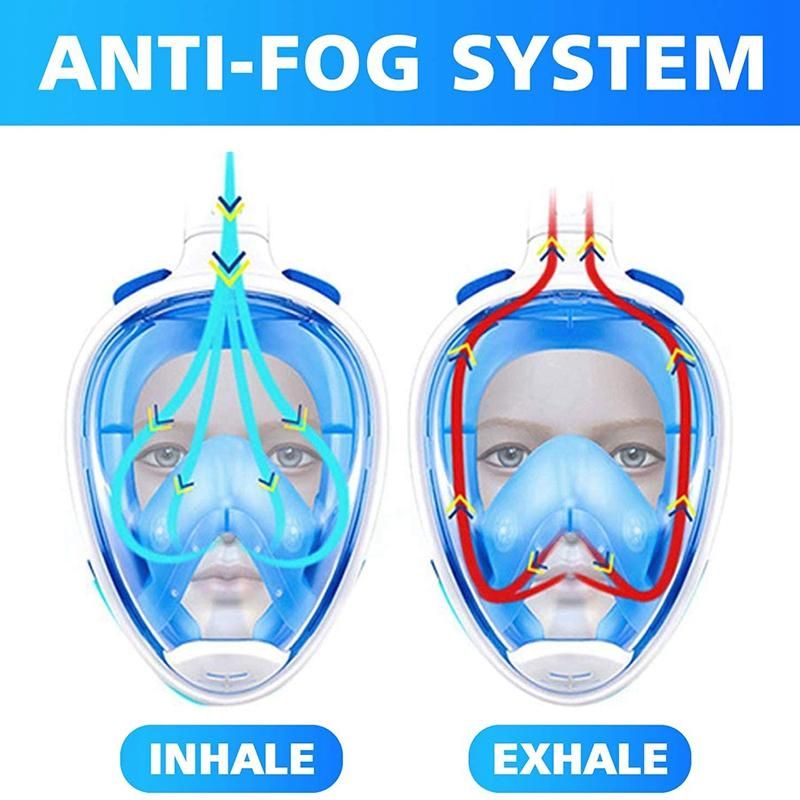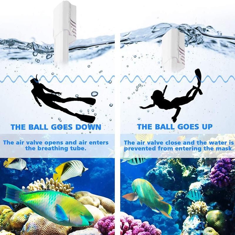 [ANTI-LEAK TOP SNORKEL]Using the liquid silicone skirt to ensure the full adherence to face, the effectively prevents water from getting into the Snorkeling.the snorkel as you diving in because of its built-in standard ball float system is able to stop the water from entering the tube when submerged.The snorkel mask has three completely separate air channels(Intermediate air intake, air outlet on both sides),thus ensuring that you inhale fresh air every time.