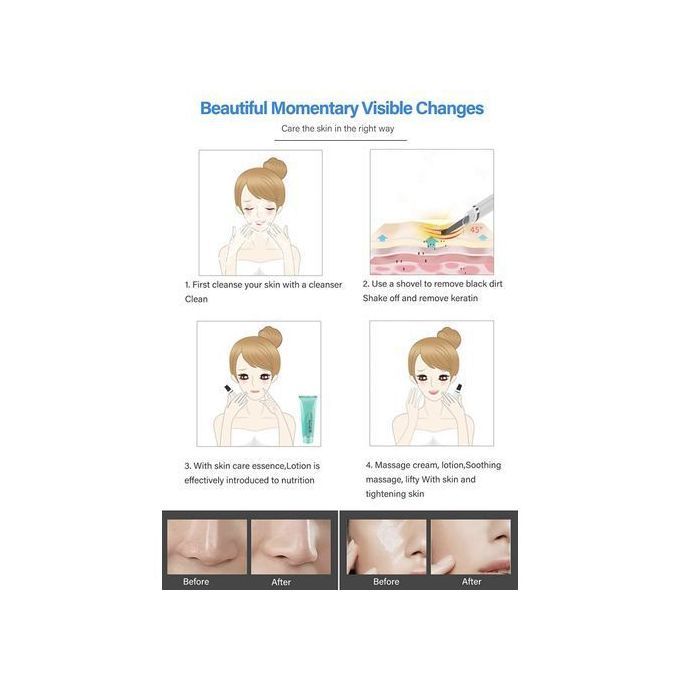 Facial skin ultrasonic scrubber works for gently peel horniness and skin rejuvenation. It removes and eliminates dead cell effectively to avoid the cuticle stacking. When using for several days, this ultrasonic facial cleaner can relieve melanin and dirt, firm wrinkles and whiten skin, helping restore the elasticity of skin and make your skin firm, smooth and delicate.