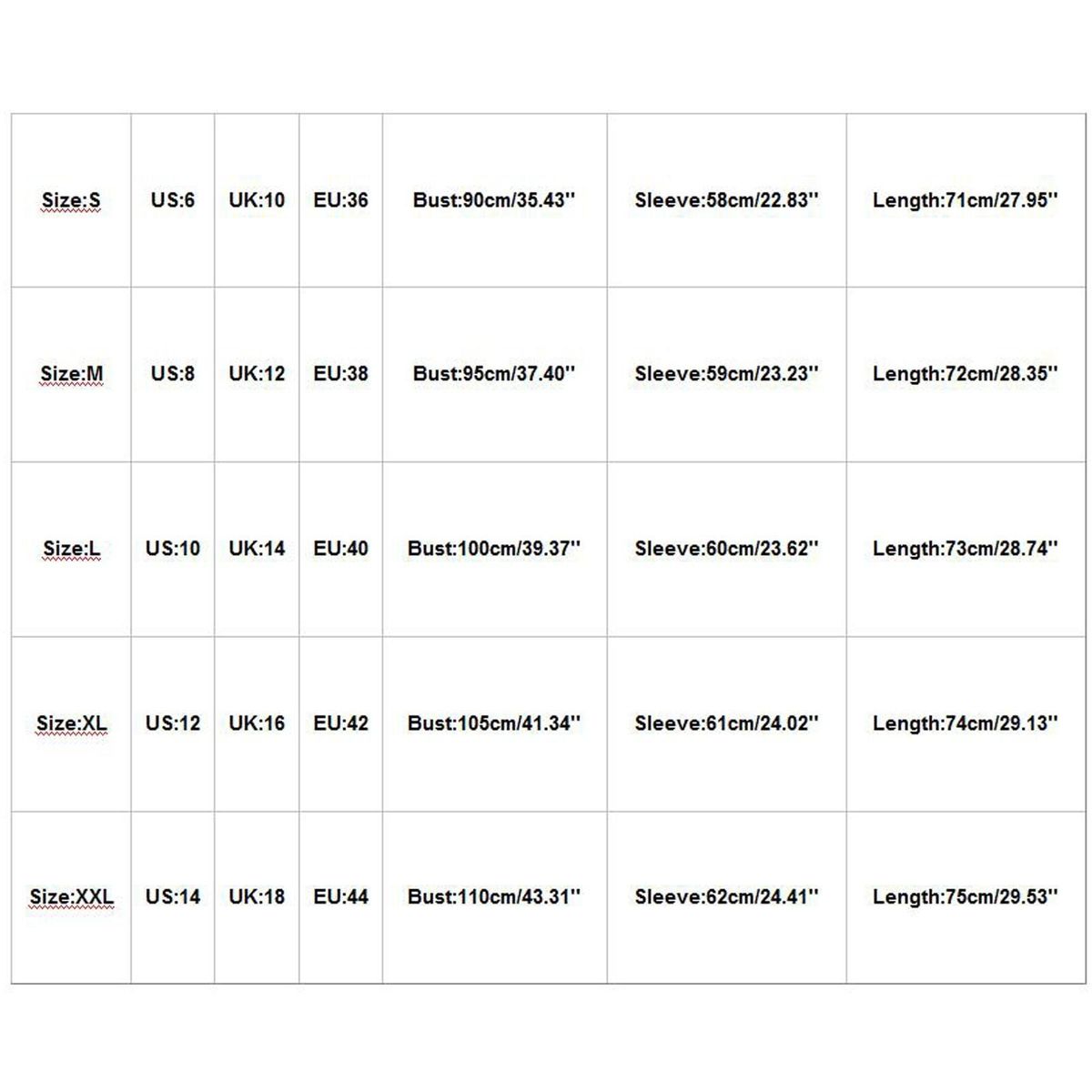 Size: XXL US: 14 UK: 18 EU: 44 Bust: 110cm/43.31'' Sleeve: 62cm/24.41'' Length: 75cm/29.53''