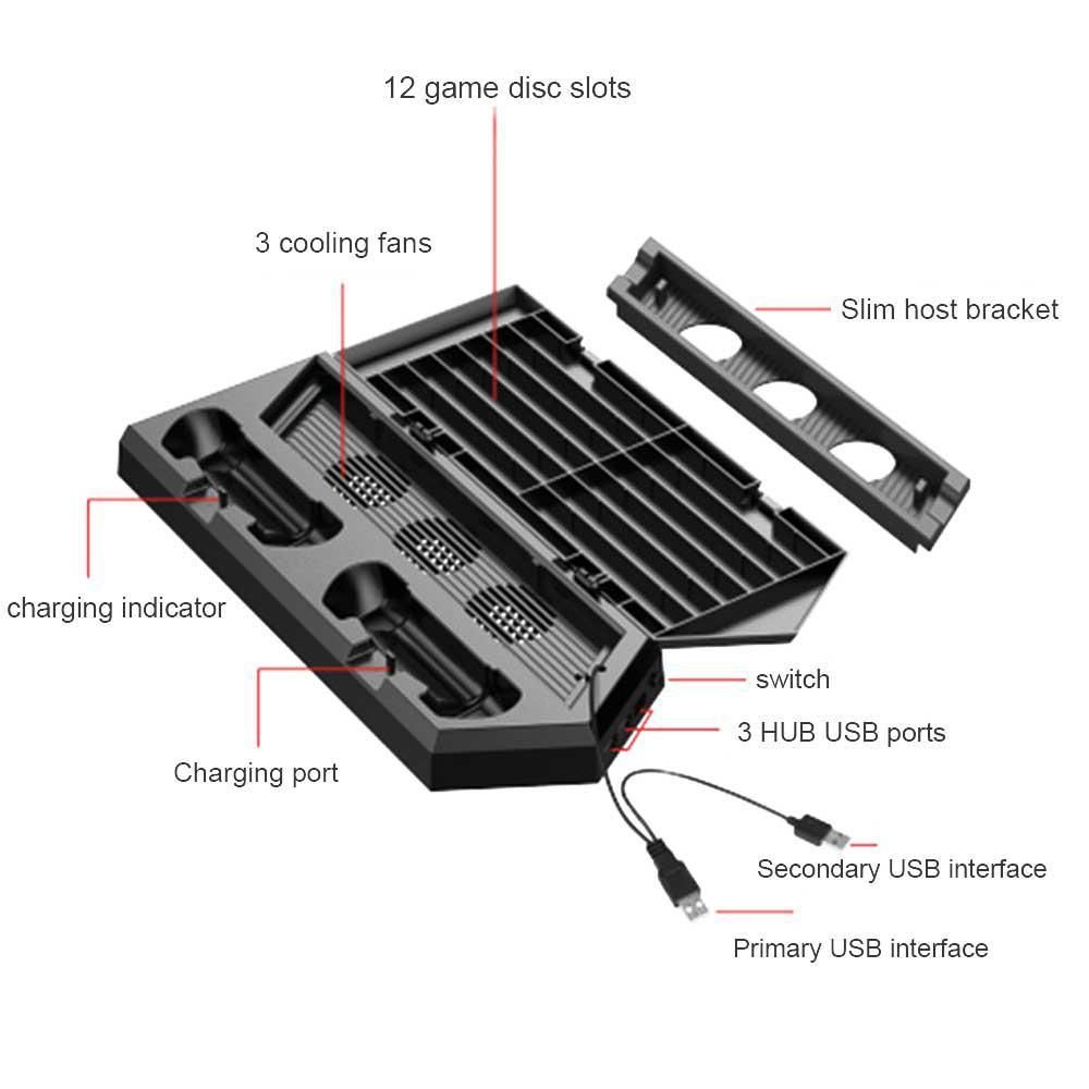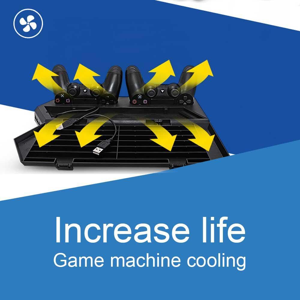 All-In-One: for PS4 console vertical stand + cooler + dual controller charging station + USB / HUB ports.