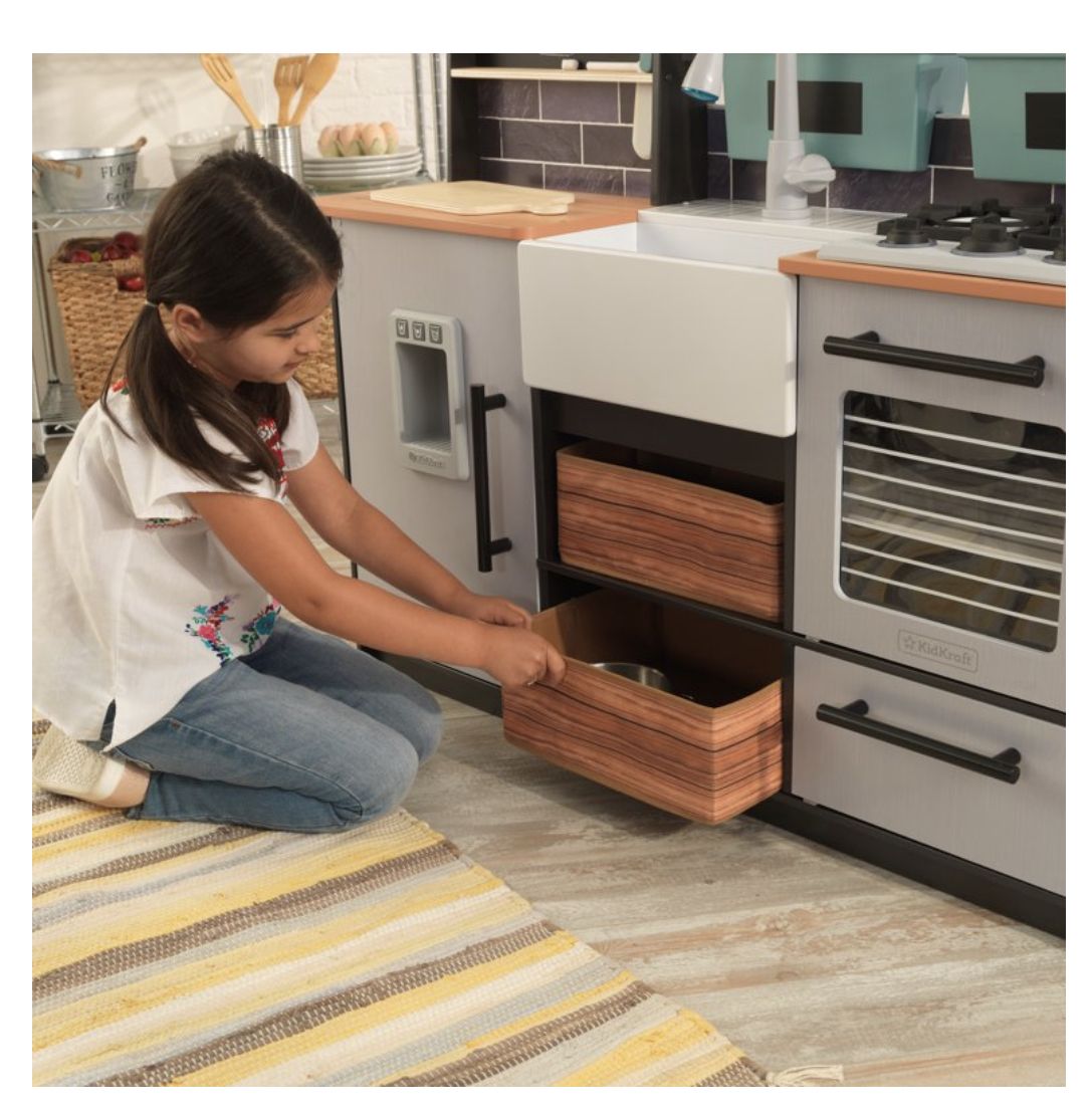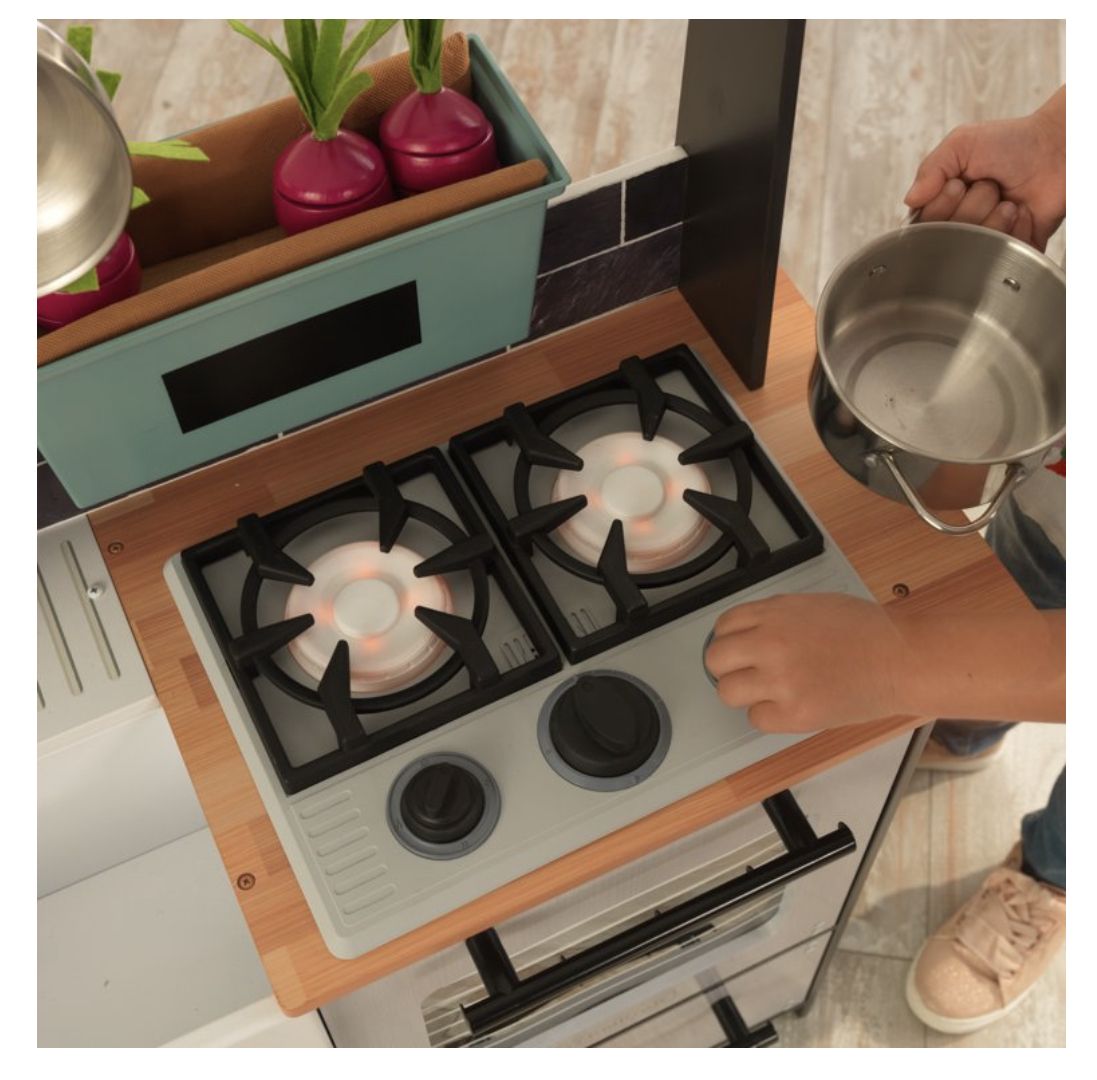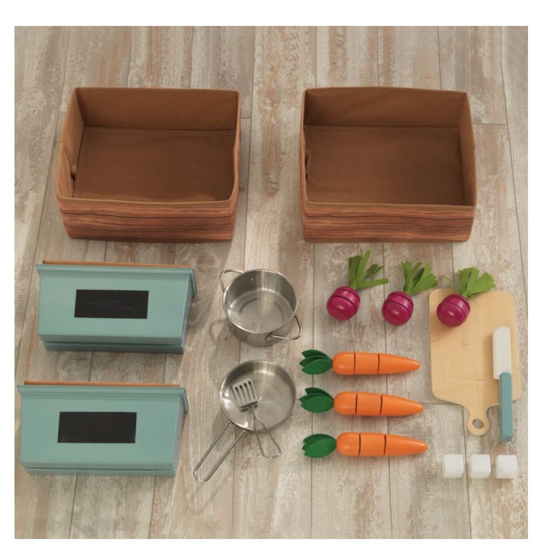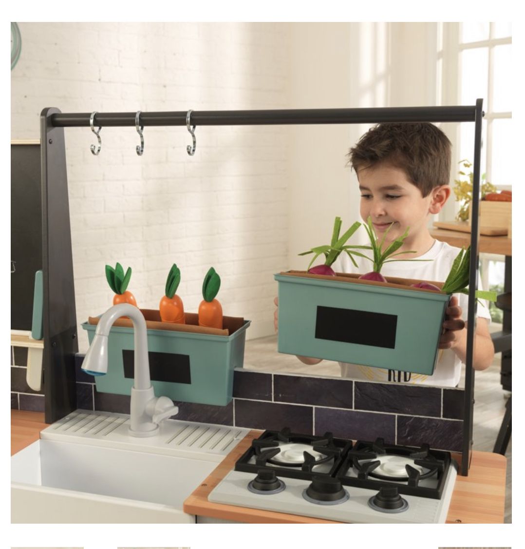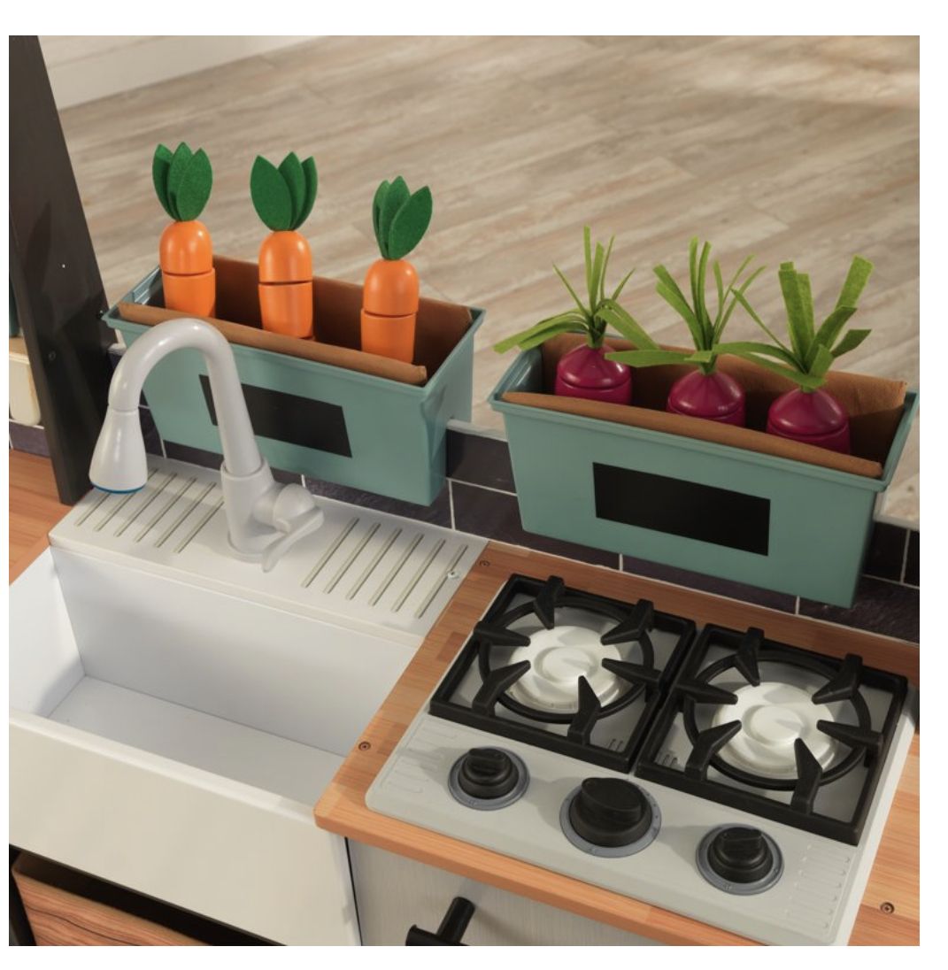 Inspire delicious fun for little foodies with the trendsetting KidKraft Farm to Table Play Kitchen with EZ Kraft Assembly™! Kids can show off their green thumbs as they tend to the adorable window box with planted carrots and purple onions that can be pulled and chopped on the cutting board with the wooden knife. Kids will love the fun crunch sound of chopping veggies, which can then be sauteed on the cooktop with light and sound motion sensors. The importance of washing hands before and after cooking can be learned with the large farmhouse sink, which features lights and running water sounds! Learning to organize is fun for little ones with the large refrigerator with ice maker that dispenses pretend cubes, and the two wood-print storage crates. With convenient hanging hooks to hold the included spatula, pot and pan and a large chalkboard to feature the daily specials, this kitchen whips up fun and cooks up memories for little chefs. Speed up assembly time with the innovative EZ Kraft Assembly™, which means less building time and more playing time!