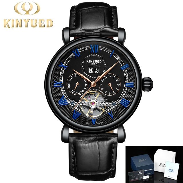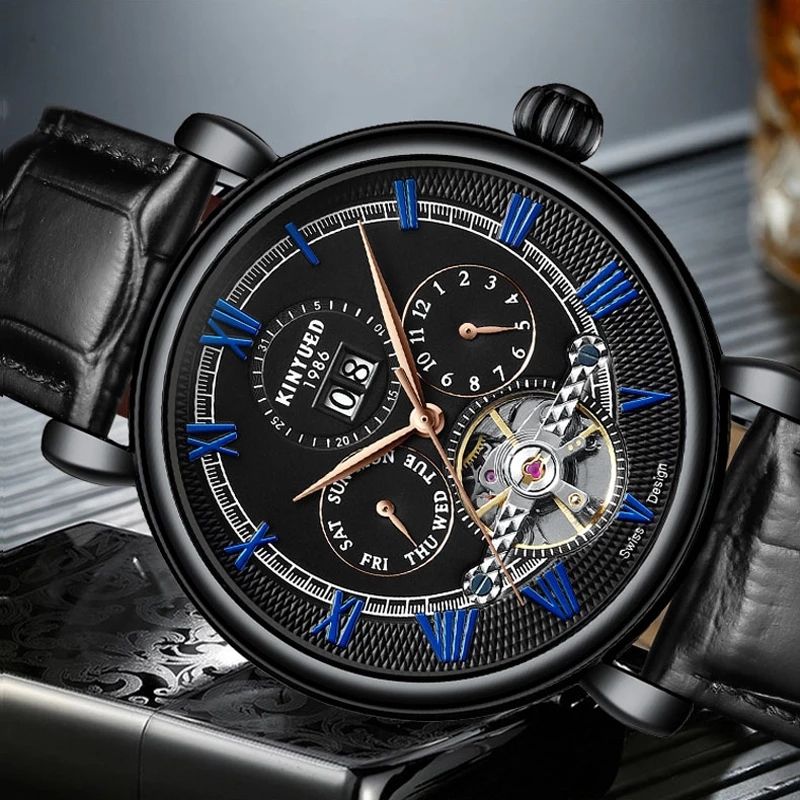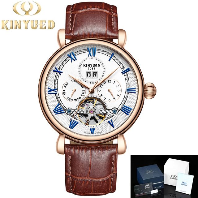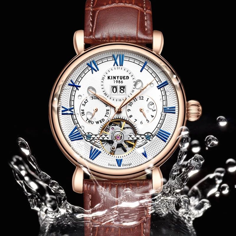 kinyued official flagship store original watch;Kinyued creative design and high quality material.Round: Made of high-quality stainless steel, hard enough and durable, genuine leather strap to ensure long service life, automatic five-hand tourbillon, mineral glass coating setting, stylish hollow design.Features: Dual calendar, time, date, week and month, easy to use,The appearance is high-end, elegant and modern, elegant and generous, especially suitable for modern and fashionable men, suitable for various occasions.Waterproof: 30m daily life waterproof, suitable for daily use, hand washing, rain, splashing sweat or short-term soaking, support cold shower and swimming. (don't pull the button in the water)Gifts: Watches are good gifts, birthdays, anniversaries, friends, relatives, father's day, graduation gifts, Valentine's Day gifts, good gifts for male friends.