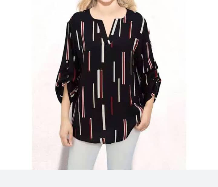 This V neck Bangkok plus size blouse is all you need if you wish to appear casual smart and at the same time give a mature look .its made with quality soft cotton material, that feels smooth and comfortable when worn .color black with red and white stripes running vertically.. the v neck bangkok blouse has a 3/4 sleeve. and a plus size looks and gives that casual look , when worn on blue jean it gives a mature look.