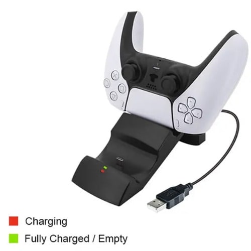 Dual Charging Station with 2 high output controller chargers can speed up charging and reduce charging time. 2 indicator lights which showing charge status, fit for PS5 Wireless Controllers. The Green light means that charging station is plugged in or fully charged. Red light means that your PS5 controller is charging.