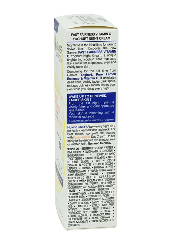 Benefits: Nighttime is the ideal time for skin to revive itself Discover the new Garnier fast fairness vitamin c yogurt night cream, a unique brightening yogurt care that acts as a mask for spotless and even skin Your skin is blooming with a renewed radiance. All Skin Type