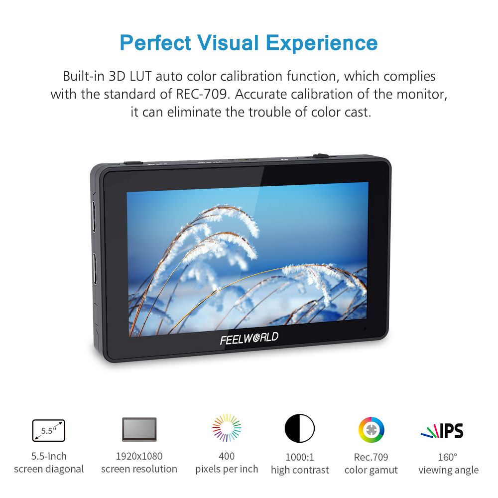 5.5 Inch IPS Screen: 1920*1080 Full HD resolution, 400 pixels per inch, 1000:1 high contrast ratio, 500cd/m² brightness, 160°wide viewing angle, provides you a perfect visual experience. Built-in 3D LUT auto color calibration function, which complies with the standard of REC-709.
