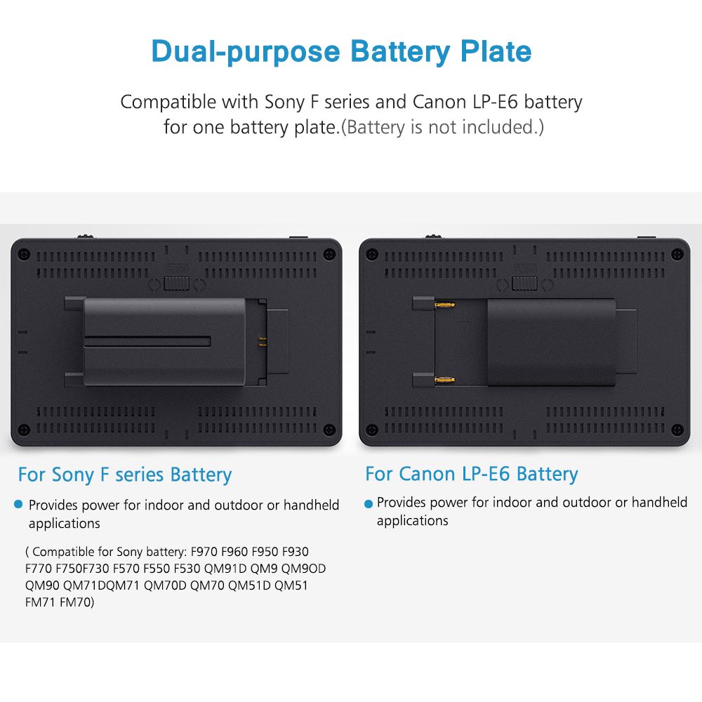 OCR Full-fit Screen & Dual-purpose Battery Plate: FEELWORLD F6 PLUS adopts full touchscreen design, can directly open the main functions on the screen, very convenient to use. Touchscreen support zooming in and out of the image. Compatible with Sony F series and LP-E6 battery for one battery plate, battery is not included.