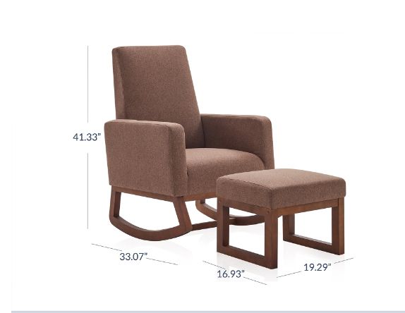 A gentle rocking motion lends a soothing feel not just for adults, but it's also very calming for babies. Use it in your child's nursery to rock your newborn to sleep or to find yourself a comfy spot while nursing or feeding the baby. The high backrest supports the body for ergonomic seating posture, reducing back pain or fatigue. Soft cushions and padded arm rests deliver optimal support for the best seating experience. Included is a matching ottoman that allows you to kick up your feet and relax.