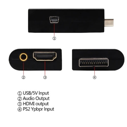 PS2 to HDMI ConverterPS2 to HDMI is mainly for Sony PS2 home game to do a high demand video converter, the PS2s 480I, 576I, 480P resolution signal lossless HDMI signal conversion, while supporting PS2 audio input, HDMI audio output and AUDIO Analog audio output, effectively prevent, HDMI transmission process, no inconvenience caused by audio.The current test found that some models of Samsung TV will not be an image, Samsung TV HDMI mainly for 50Hz please choose to buyInterface Description:1.AUDIO analog audio output interface, connect headphones or active speakers.2.HDMI Output HDMI output interface, connect HDMI TV or monitor.3.USB 5V Input USB5V power supply input interface, connect PS2 USB interface.4.PS2 Ypbpr Input pS2 color difference input interface, connected to the PS2 machine.How to set your PS2 YPbPr outputSelect the corresponding hdmi interface on the TV.Then you need to adjust your PS2 output to YPbPr mode. Setting method: boot into the Seven Stars screen without placing the disk, press the direction down and then press the X button, after entering, press the three bottom up or down to find the image output, and then select YPbPr.Please NoteSupported HDMI output Mode: Outputs pure digital HDMI video audio signals.NOT support convert to DVI signal.The PS2 must setup for Component Video Output Y Pb Pr. As opposed to RGB output. If you can't see anything on your TV when using this, you probably need to go into the Configuration Settings load PS2 without a disc and scroll through the options to change SpecificationColor: BlackDimensions: 2.79 1.35 0.55inchNet Weight: 2.11ozAccessories Description1 PS2 to HDMI Converter1 USB Cable1 User Manual