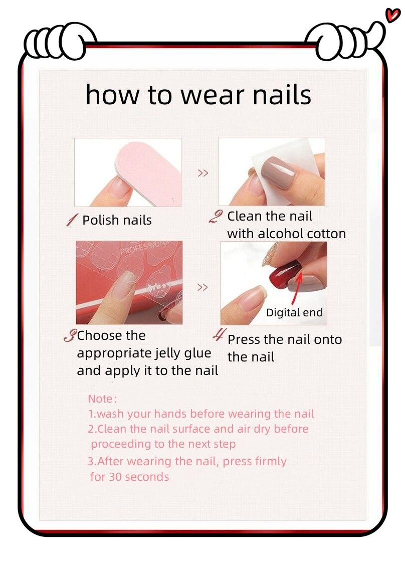 1:Remove the surface keratin by gently grinding the nail slices with a scrub, rinse and keep the nail clean and dry2: Select the right size of the nail and take the right amount of glue stickers or adhesive tape on the inside of the selected nail plate3:Attach a slice from the root of the nail to the front of the nail, hold down the nail for 8 seconds, stick it tightly