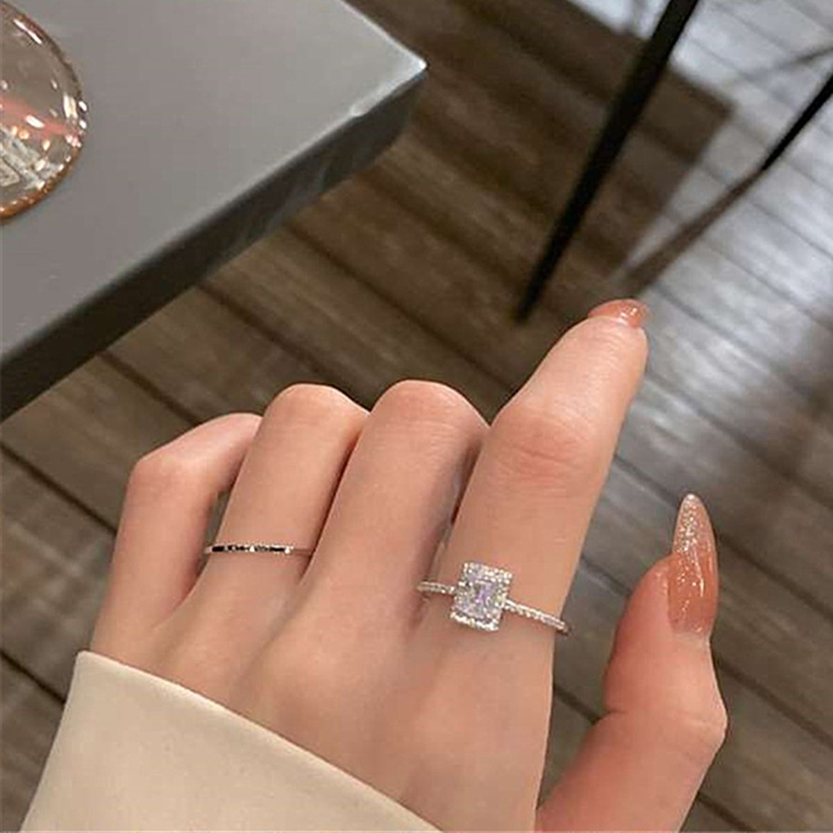 Adopting square shape and shiny rhinestone inlaid decoration, this finger ring looks very exquisite, fashionable and popular.