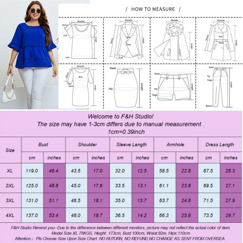 Color: Red Size: XL, 2XL, 3XL,4XL Model Size FYR: Model wear size XL ❤This is a round neck short sleev big size tops plus size blouse !!❤Style:Round Neck Short Sleeve Plus Size Blouse Big Size Tops. Please note that slight color difference should be acceptable due to the light and screen.What You Get:1 x Blouse. FQA:1. Q: Why the item haven't shipped out? A: After you place the order, We will ship the item to the rehmie warehouse within 48 hours as soon as possible, and then rehmie warehouse will send the item to you. If you find the logistics status is"to be shipped", it may be because the rehmie warehouse has not yet been shipped. Please don't worry. 2. Q: How can I choose the size? A:Please refer to the size chart and select the appropriate size according to your actual size.If you are not sure what size to choose, please call me. 3. Pls take note that all the clothes can not be returned or exchanged.4. All dimensions are measured by hand, there will be 2-3cm reasonable deviations. (1cm=0.39 inches). Pictures are only samples for reference. Due to the differences in monitor settings, the colors shown in the photograph may not correspond 100% to those in the items themselves. 5.For transportation needs, the cloth that you've received will have a fold phenomenon. Please don't worry, this fold situation will disappear after the first time you clear or ironing.
