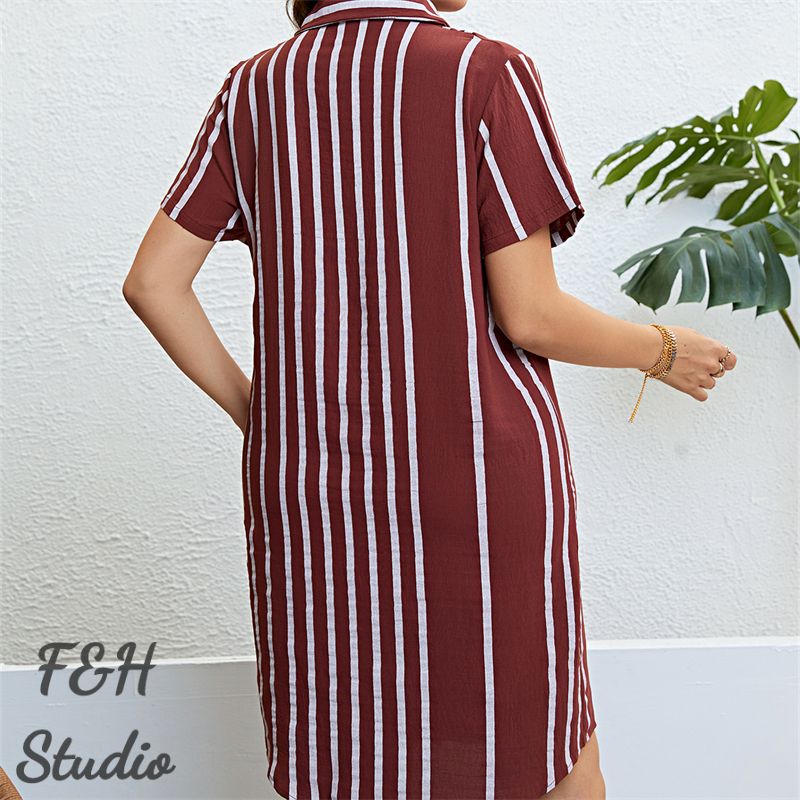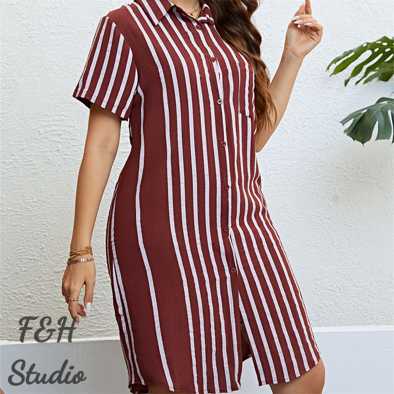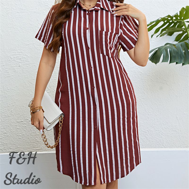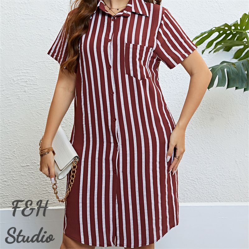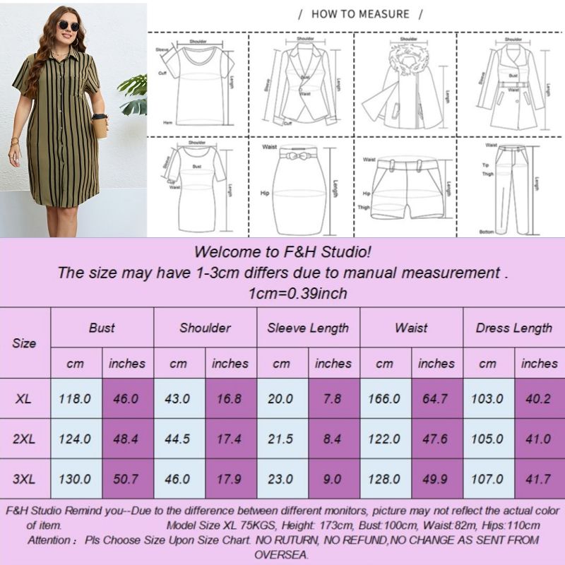 Size:XL, 2XL, 3XL. Model Size FYR: Model wear size XL.❤This is a short sleeve stripe print polo neck plus size dress !!❤Style:Women Polo Neck Short Sleeve Stripe Print Slim Fit Plus Size Dress.Please note that slight color difference should be acceptable due to the light and screen.What You Get:1 x Dress. FQA:1. Q: Why the item haven't shipped out?A: After you place the order, We will ship the item to the rehmie warehouse within 48 hours as soon as possible, and then rehmie warehouse will send the item to you. If you find the logistics status is"to be shipped", it may be because the rehmie warehouse has not yet been shipped. Please don't worry.2. Q: How can I choose the size?A:Please refer to the size chart and select the appropriate size according to your actual size.If you are not sure what size to choose, please call me. 3. Pls take note that all the clothes can not be returned or exchanged.4. All dimensions are measured by hand, there will be 2-3cm reasonable deviations. (1cm=0.39 inches). Pictures are only samples for reference. Due to the differences in monitor settings, the colors shown in the photograph may not correspond 100% to those in the items themselves. 5.For transportation needs, the cloth that you've received will have a fold phenomenon. Please don't worry, this fold situation will disappear after the first time you clear or ironing.