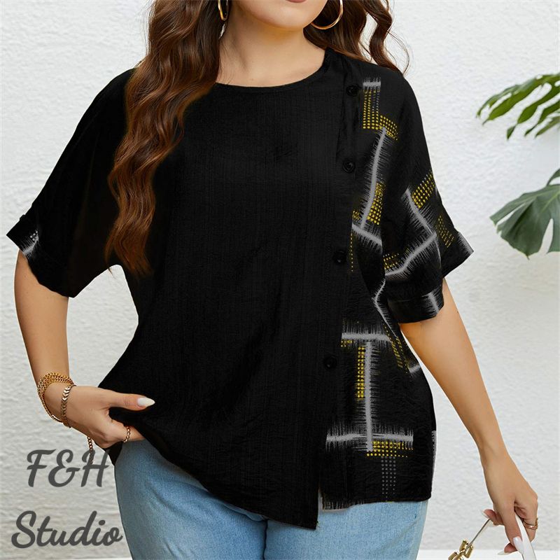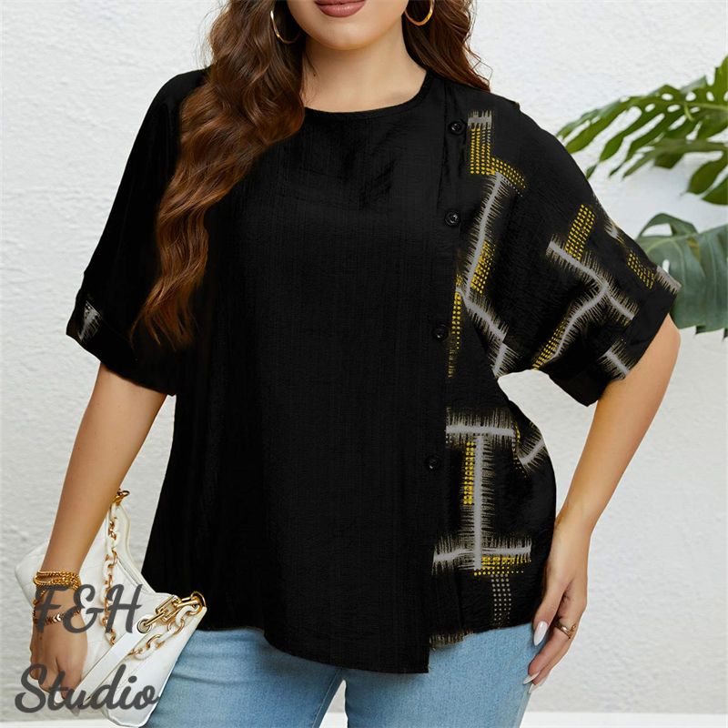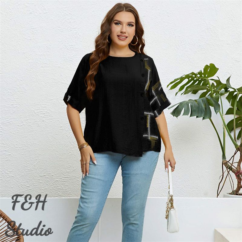 Color: Black Size: XL, 2XL, 3XL Model Size FYR: Model wear size XL ❤This is a round neck short sleeve big size tops plus size blouse !!❤Style:Round Neck Short Sleeve Plus Size Blouse Big Size Tops. Please note that slight color difference should be acceptable due to the light and screen.What You Get:1 x Blouse. FQA:1. Q: Why the item haven't shipped out? A: After you place the order, We will ship the item to the rehmie warehouse within 48 hours as soon as possible, and then rehmie warehouse will send the item to you. If you find the logistics status is"to be shipped", it may be because the rehmie warehouse has not yet been shipped. Please don't worry. 2. Q: How can I choose the size? A:Please refer to the size chart and select the appropriate size according to your actual size.If you are not sure what size to choose, please call me. 3. Pls take note that all the clothes can not be returned or exchanged.4. All dimensions are measured by hand, there will be 2-3cm reasonable deviations. (1cm=0.39 inches). Pictures are only samples for reference. Due to the differences in monitor settings, the colors shown in the photograph may not correspond 100% to those in the items themselves. 5.For transportation needs, the cloth that you've received will have a fold phenomenon. Please don't worry, this fold situation will disappear after the first time you clear or ironing.