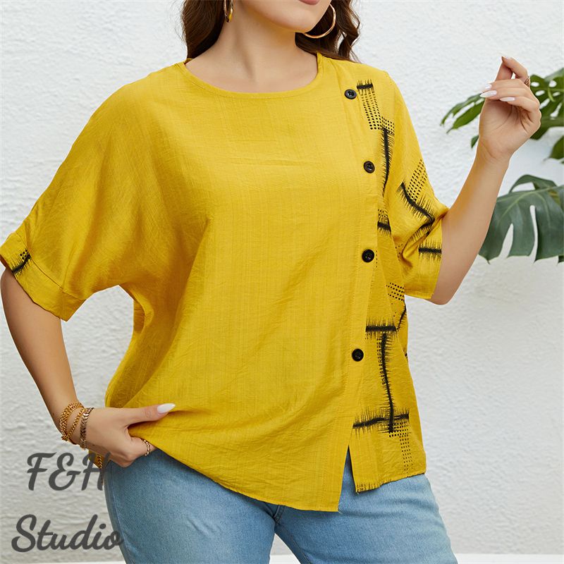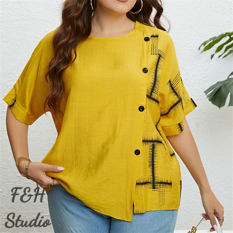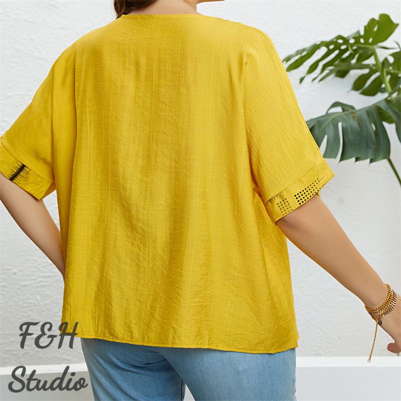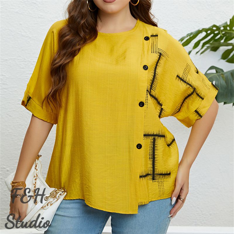 Color: Yellow Size: XL, 2XL, 3XL Model Size FYR: Model wear size XL ❤This is a round neck short sleeve big size tops plus size blouse !!❤Style:Round Neck Short Sleeve Plus Size Blouse Big Size Tops. Please note that slight color difference should be acceptable due to the light and screen.What You Get:1 x Blouse. FQA:1. Q: Why the item haven't shipped out? A: After you place the order, We will ship the item to the rehmie warehouse within 48 hours as soon as possible, and then rehmie warehouse will send the item to you. If you find the logistics status is"to be shipped", it may be because the rehmie warehouse has not yet been shipped. Please don't worry. 2. Q: How can I choose the size? A:Please refer to the size chart and select the appropriate size according to your actual size.If you are not sure what size to choose, please call me. 3. Pls take note that all the clothes can not be returned or exchanged.4. All dimensions are measured by hand, there will be 2-3cm reasonable deviations. (1cm=0.39 inches). Pictures are only samples for reference. Due to the differences in monitor settings, the colors shown in the photograph may not correspond 100% to those in the items themselves. 5.For transportation needs, the cloth that you've received will have a fold phenomenon. Please don't worry, this fold situation will disappear after the first time you clear or ironing.