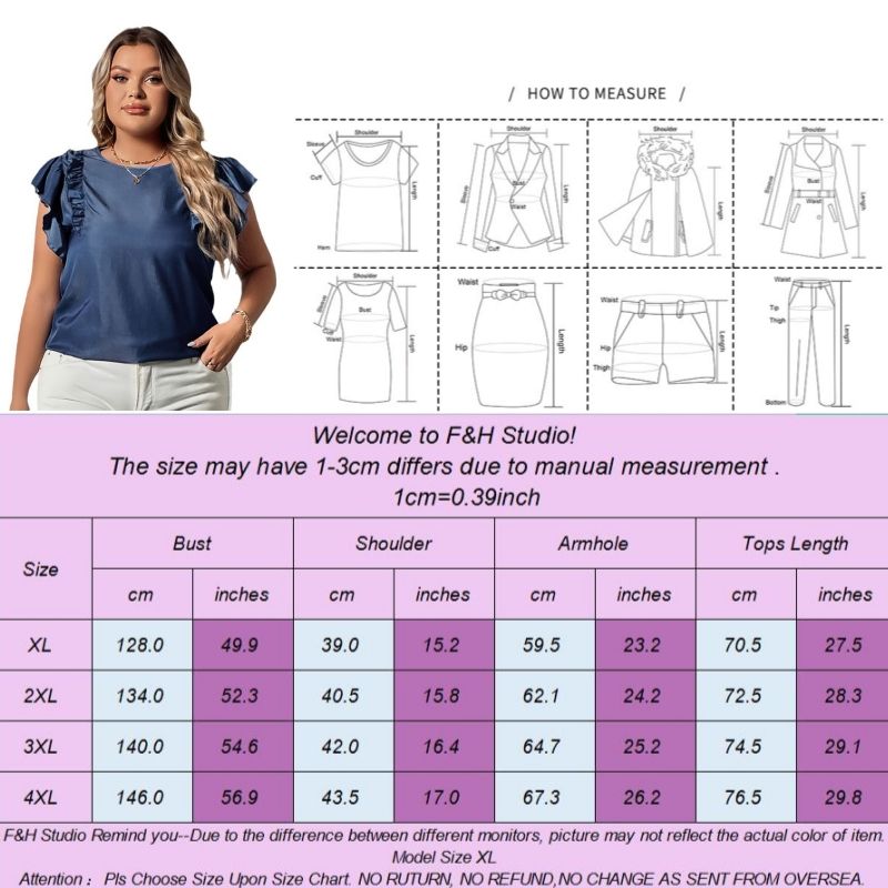 Color:Black Size: XL,2XL, 3XL,4XL ❤This is a short sleeve big size tops plus size blouse !!❤Style:F&H 3600-XL-4XL Fashionable Women Ruffled Short Sleeves Plus Size Blouse. Please note that slight color difference should be acceptable due to the light and screen.What You Get:1 x Blouse. FQA:1. Q: Why the item haven't shipped out? A: After you place the order, We will ship the item to the rehmie warehouse within 48 hours as soon as possible, and then rehmie warehouse will send the item to you. If you find the logistics status is"to be shipped", it may be because the rehmie warehouse has not yet been shipped. Please don't worry. 2. Q: How can I choose the size? A:Please refer to the size chart and select the appropriate size according to your actual size.If you are not sure what size to choose, please call me. 3. Pls take note that all the clothes can not be returned or exchanged.4. All dimensions are measured by hand, there will be 2-3cm reasonable deviations. (1cm=0.39 inches). Pictures are only samples for reference. Due to the differences in monitor settings, the colors shown in the photograph may not correspond 100% to those in the items themselves. 5.For transportation needs, the cloth that you've received will have a fold phenomenon. Please don't worry, this fold situation will disappear after the first time you clear or ironing.