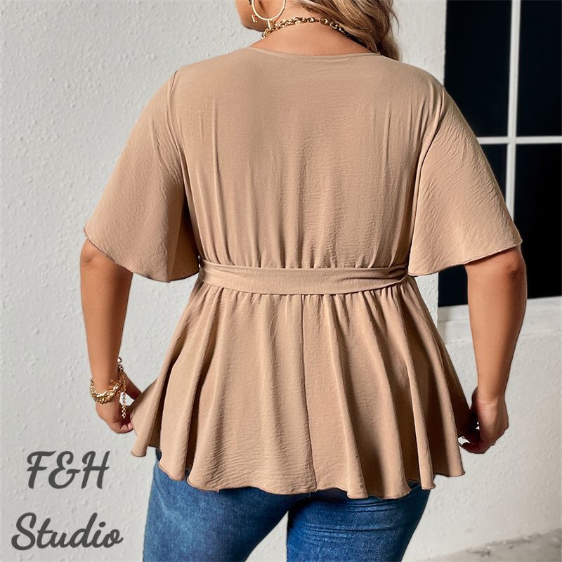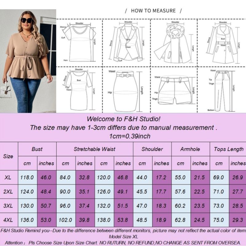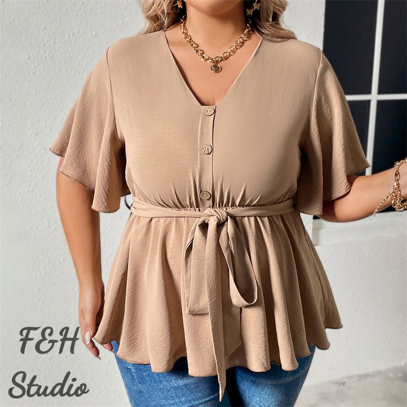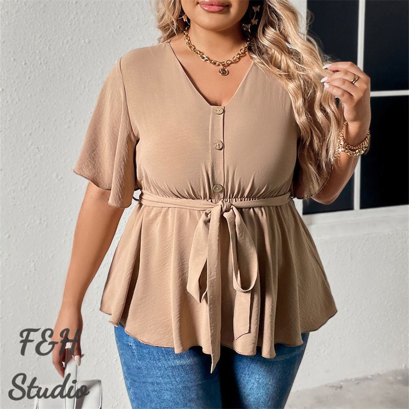 Color:Khaki Size: XL,2XL, 3XL,4XL ❤This is a short sleeve big size tops plus size blouse !!❤Style:F&H 3603-XL-4XL Summer V Neck Plus Size Casual Women Blouse. Please note that slight color difference should be acceptable due to the light and screen.What You Get:1 x Blouse. FQA:1. Q: Why the item haven't shipped out? A: After you place the order, We will ship the item to the rehmie warehouse within 48 hours as soon as possible, and then rehmie warehouse will send the item to you. If you find the logistics status is"to be shipped", it may be because the rehmie warehouse has not yet been shipped. Please don't worry. 2. Q: How can I choose the size? A:Please refer to the size chart and select the appropriate size according to your actual size.If you are not sure what size to choose, please call me. 3. Pls take note that all the clothes can not be returned or exchanged.4. All dimensions are measured by hand, there will be 2-3cm reasonable deviations. (1cm=0.39 inches). Pictures are only samples for reference. Due to the differences in monitor settings, the colors shown in the photograph may not correspond 100% to those in the items themselves. 5.For transportation needs, the cloth that you've received will have a fold phenomenon. Please don't worry, this fold situation will disappear after the first time you clear or ironing.