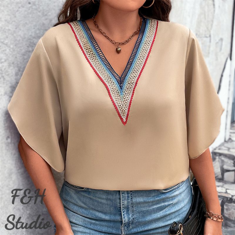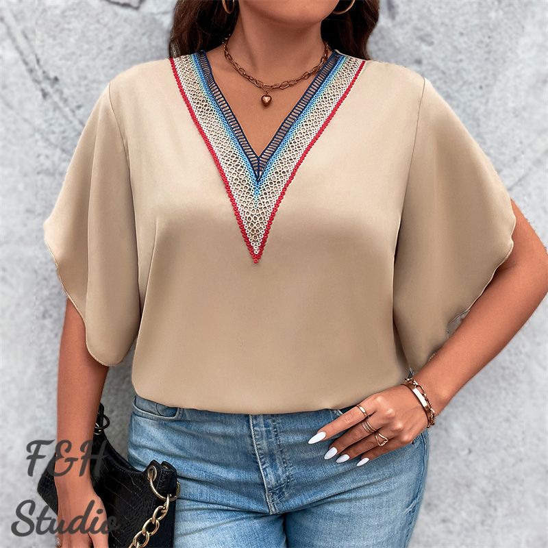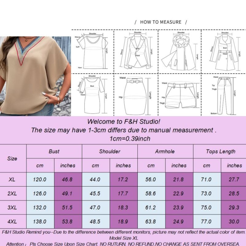 Color:Light Brown Size: XL,2XL, 3XL,4XL ❤This is a short sleeve big size tops plus size blouse !!❤Style:F&H 3607-XL-4XL Casual V Neck Short Sleeve Women Plus Size Blouse. Please note that slight color difference should be acceptable due to the light and screen.What You Get:1 x Blouse. FQA:1. Q: Why the item haven't shipped out? A: After you place the order, We will ship the item to the rehmie warehouse within 48 hours as soon as possible, and then rehmie warehouse will send the item to you. If you find the logistics status is"to be shipped", it may be because the rehmie warehouse has not yet been shipped. Please don't worry. 2. Q: How can I choose the size? A:Please refer to the size chart and select the appropriate size according to your actual size.If you are not sure what size to choose, please call me. 3. Pls take note that all the clothes can not be returned or exchanged.4. All dimensions are measured by hand, there will be 2-3cm reasonable deviations. (1cm=0.39 inches). Pictures are only samples for reference. Due to the differences in monitor settings, the colors shown in the photograph may not correspond 100% to those in the items themselves. 5.For transportation needs, the cloth that you've received will have a fold phenomenon. Please don't worry, this fold situation will disappear after the first time you clear or ironing.